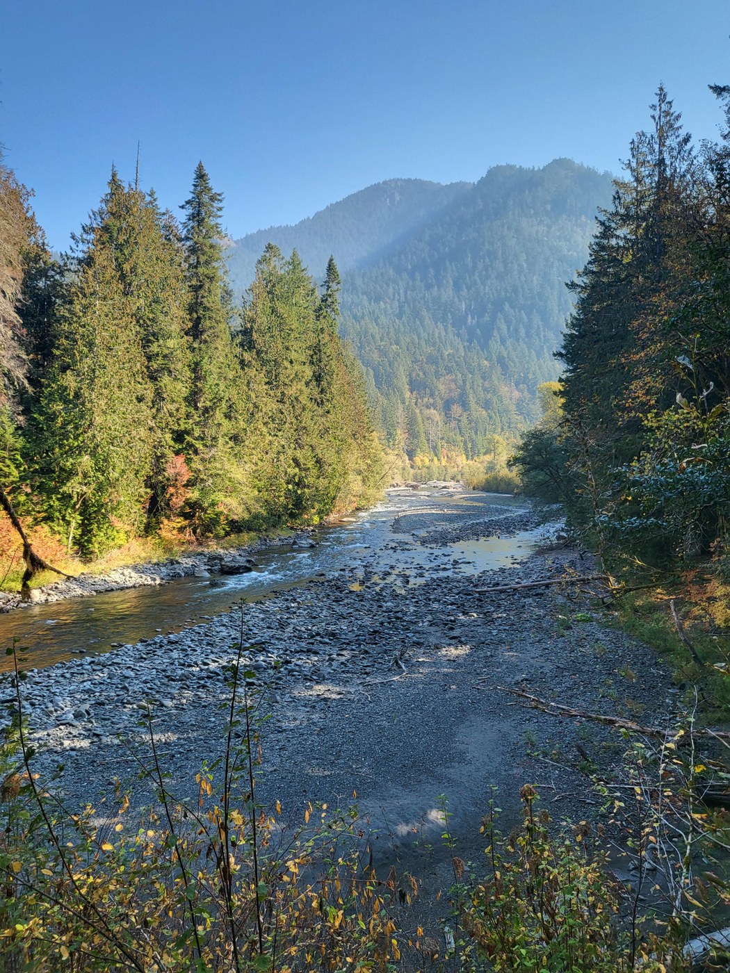 The trail is beautiful, especially after you cross into the park. The beginning of the trail is about .5 mi following an easement that connects to the parking area. From there, you wander through lush ferns and mossy cedars, eventually making your way down into the river basin. The Elwha is very low right now, but beautiful and always worth a visit.