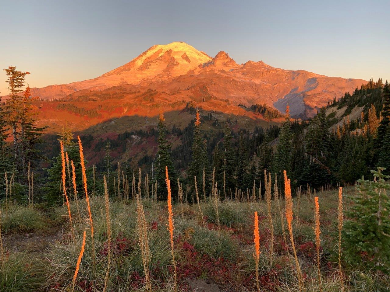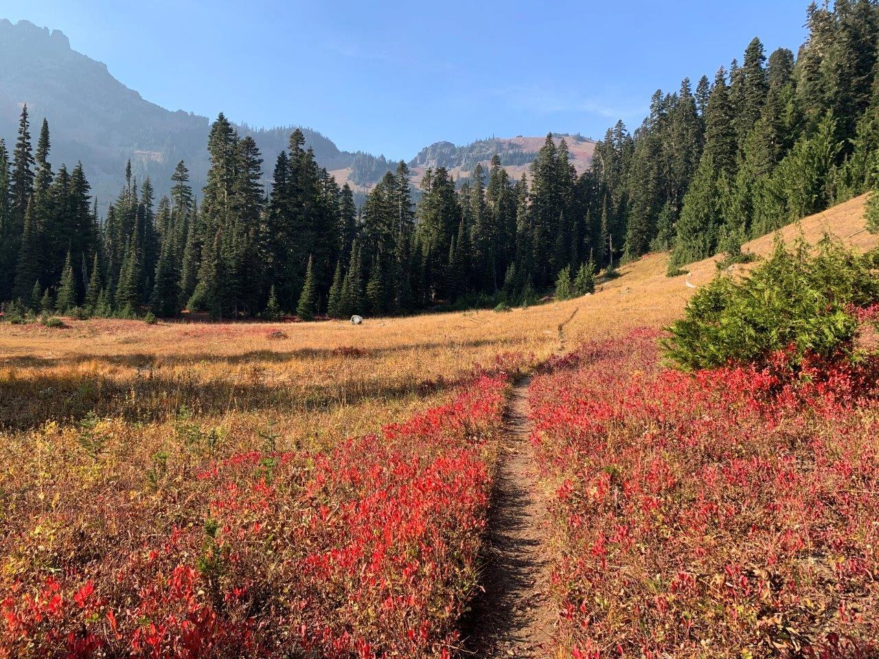 After picking up self-issue permit, decided to start at Owyhigh Lakes, off Hwy 123. Started Saturday afternoon ~11:30 am. There were 3 other cars at "TH"/pull out along the side of road that may fit ~7 cars. Hiked Eastern Loop clockwise. The Eastside trail from Deer Creek camp to Grove of the Patriarchs/Stevens Canyon entrance is pretty flat, cruiser trailer, except for the multiple down trees you have to go over or around (nothing difficult). The foot/log bridges have all seen better days (i.e., they are slanted, some more so then others). They were dry, so no problem crossing any of them. I averaged ~2.7 miles/hour on this section. I could hear cars along parts of this stretch. There is some water access along the trail. The side trail to Grove of the Patriarchs was roped off and said it was closed due to bridge being out. From Grove of the Patriarchs, I headed right along road to access Cowlitz Divide TH instead of staying on Eastside trail. Trail gains elevation, but overall trail is in good condition. Olallie Creek camp has a toilet and the camps are tucked among the trees. There is water here. At Wonderland junction, took a right. ~5500' there are great 360 views, including Rainer, Adams (although viability was limited due to Goat Rocks fire), etc. Met a nice guy who started running the entire Wonderland Trail the day before and was ~70 miles in. From here start dropping down to Indian Bar. Enjoyed the views at Indian Bar and filled up water. I met a volunteer with https://www.cascadescarnivore.org/ who was on her way to check cameras in the area and put out some tasty treats for the carnivores. The hike from Indian Bar to Panhandle Gap seemed very slow going between elevation gain and regular stops to enjoy the beauty and catch my breath (averaged ~1.6 miles/hour). There is water along the trail before and after Pandhandle Gap. No snow. After Panhandle Gap on saw 5 goats on the hillside to the left and a heard of ~11 on far hillside to the right. The last of the day hikers were leaving as I arrived Summerland on Sunday night. 2 other groups camped at Summerland Sunday night. 3 deer (buck, mama, & doe) were grazing through camp Monday morning. Trail down to Fryingpan Creek TH is in good condition. To complete the Eastern Loop, I walked along road until I arrived at Owyhigh Lakes TH. Trail gains elevation and is primarily in the trees/shade. Some down trees. Again, nothing overly complicated to go over or around. Tamanos Creek camp is in the woods and ~.5 miles from Owyhigh Lakes were the views opened up. Beautiful fall colors. I thought about getting water from lakes, but the water didn't look that nice and I still had a little left. But if you need water, get it here, since the next water source is closer to Deer Creek. Trail back to Deer Creek camp/TH is primarily in the trees and a semi-cruiser trail as the trail descends. Some more down trees and foot bridges that have seen better days. Arrived back at car Monday evening. No other cars. Smoke really rolled in Sunday night/Monday. I'm not a trail runner, but the Eastside trail and Owyhigh Lakes trail would be good trails to do so. Passed another trail runner coming down Owyhigh Lakes trail.