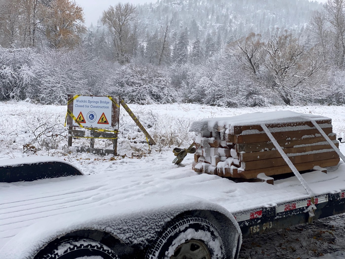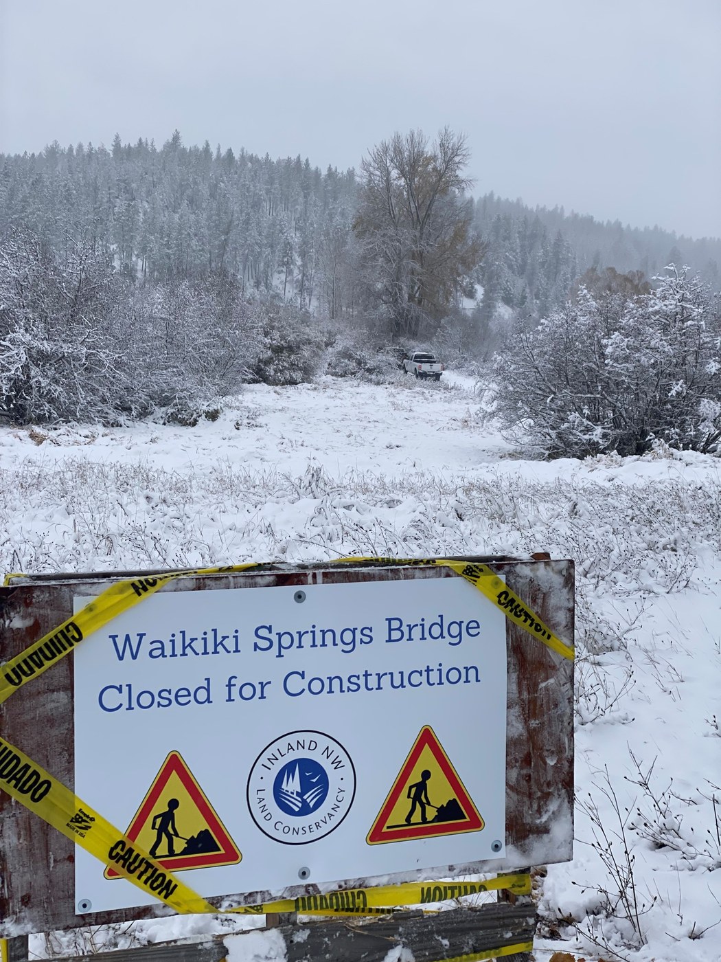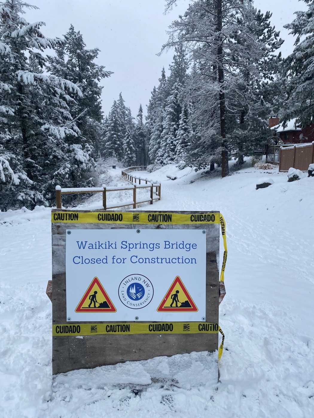 Hiked down the switchbacks on the Waikiki Springs trail today and encountered construction beginning at the bridge crossing the Little Spokane River. It was a beautiful day for a winter snowy hike at Waikiki Springs. Garco construction will be working for 3-4 weeks to replace the old wood decking on the bridge with new concrete decking. The contractor has the area well signed and fencing will be going up soon to help keep everyone safe. Please stay away from the construction zone and maybe by Thanksgiving the bridge construction will be completed and we can all resume hiking the trails on the north side of the river.