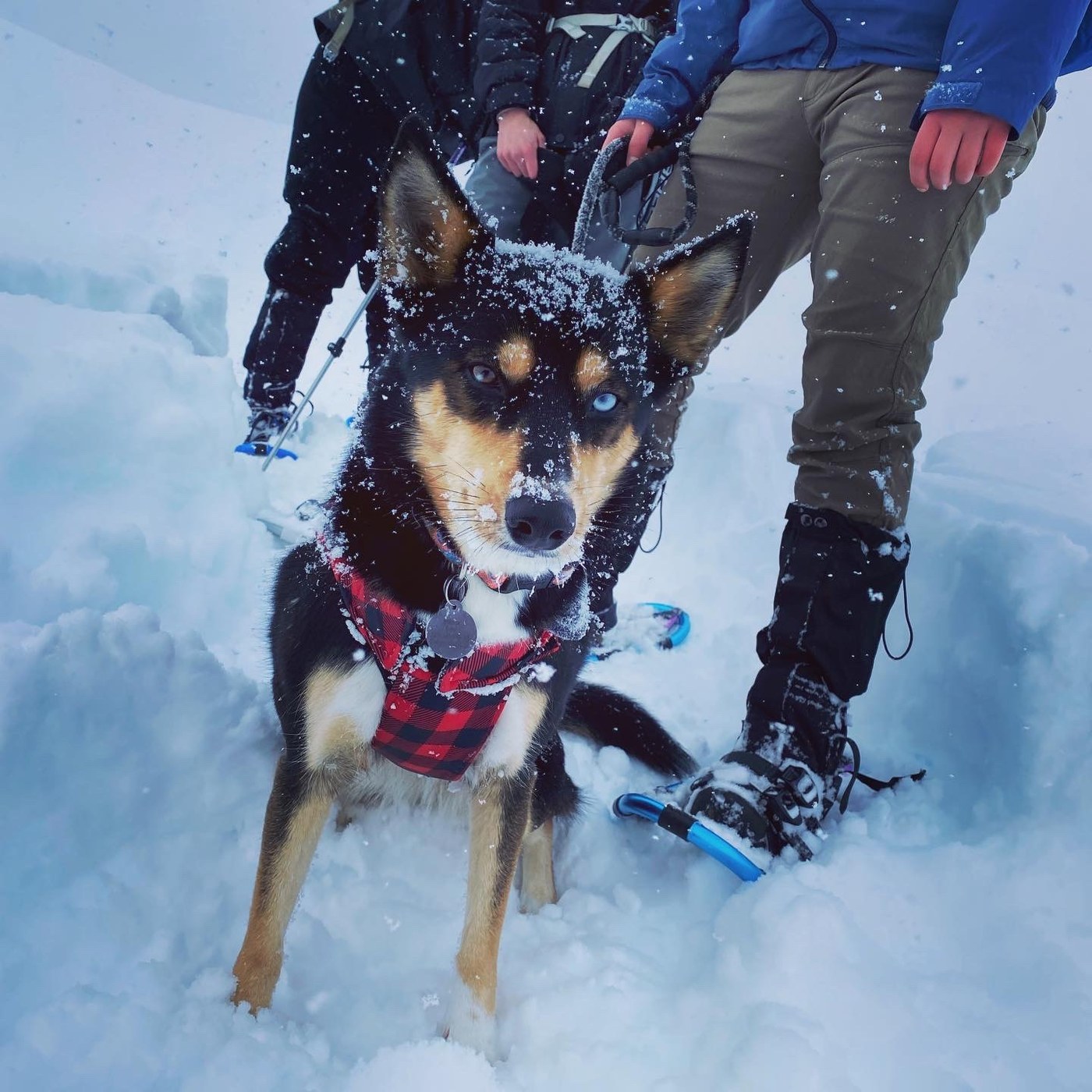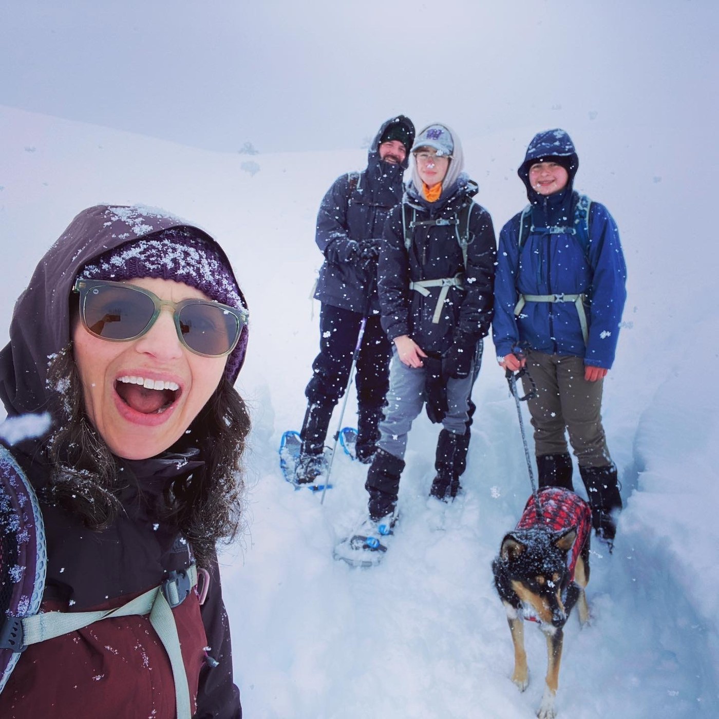 Two parents and two teens on snowshoes, plus two dogs. We arrived at the parking area about 9:30 on the Monday before Christmas. The Heather Meadows ski area and lodge were closed today so it was much quieter than I’ve ever seen it. The bathroom by the parking lot trailhead is open although not maintained so plan accordingly. There was fresh powder so most tracks in the area were covered. Visible to follow but not packed… Our husky mix loved every minute of the deep snow. The little Pom-chi made it about three quarters and then wanted a backpack ride. It was definitely choose your own adventure at the top near Artist point. The bathroom roof still visible. We went up a little bit toward Huntoon point but no views or cloud breaks so we didn’t go all the way. Great quiet day on the mountain, it was about 19 degrees, and snowing most of the time we were out. We saw 95 percent skiers, and only a couple other snowshoers. I would definitely recommend coming on a day Heather Meadows ski area is closed. We have always come on a busy weekend and it can be so crazy and overcrowded.
