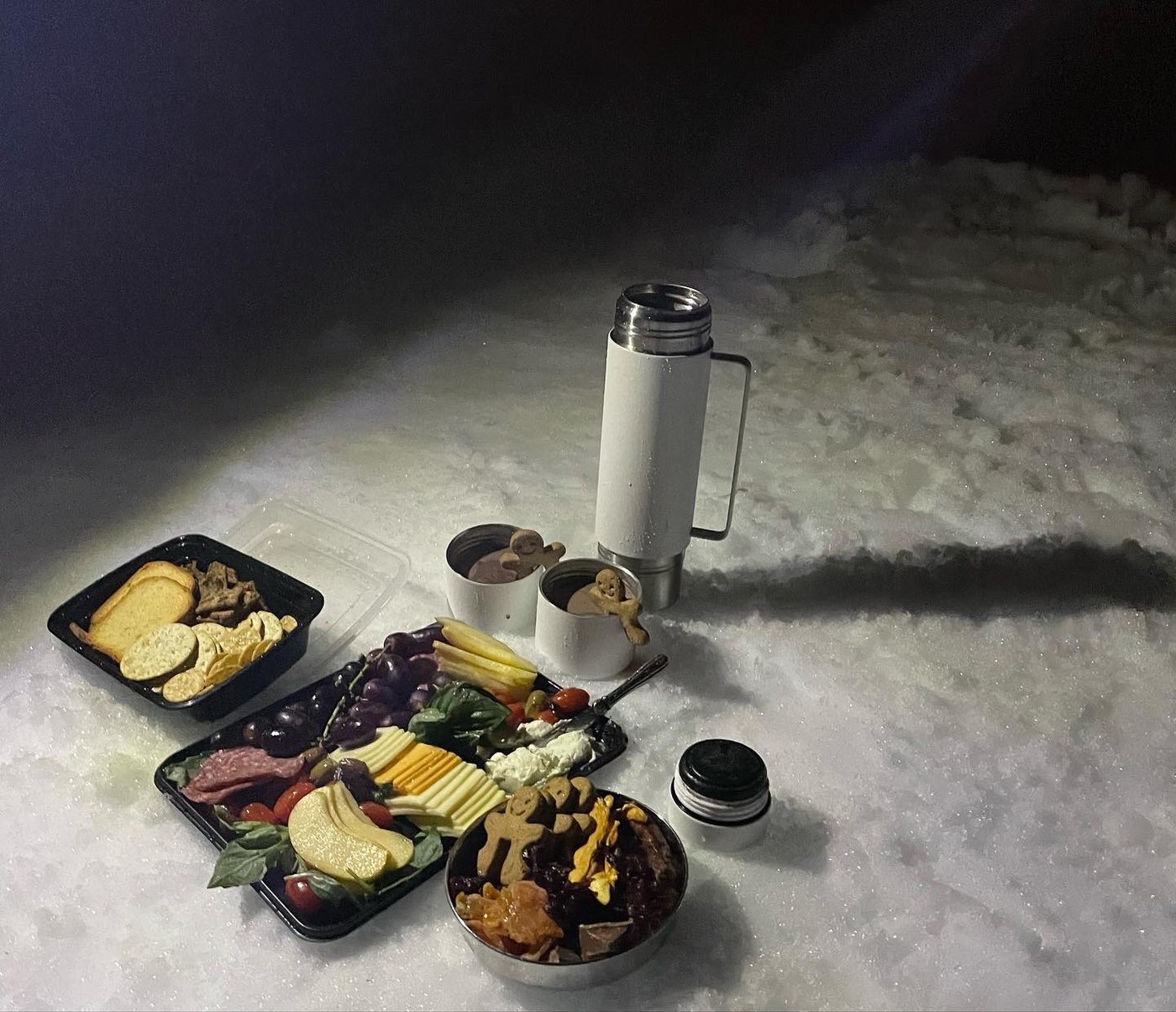 We walked out into the spit to take a short break for a snack. My friend surprised us by pulling out a fancy charcuterie spread and hot cocoa that she had brought to share. It was very festive! We ate and rehydrated, but soon we were getting cold, so it was time to continue on around the pond. The bridges on the back side of the pond are full of snow almost to the railings. Kids and dogs should be extra cautious on them.