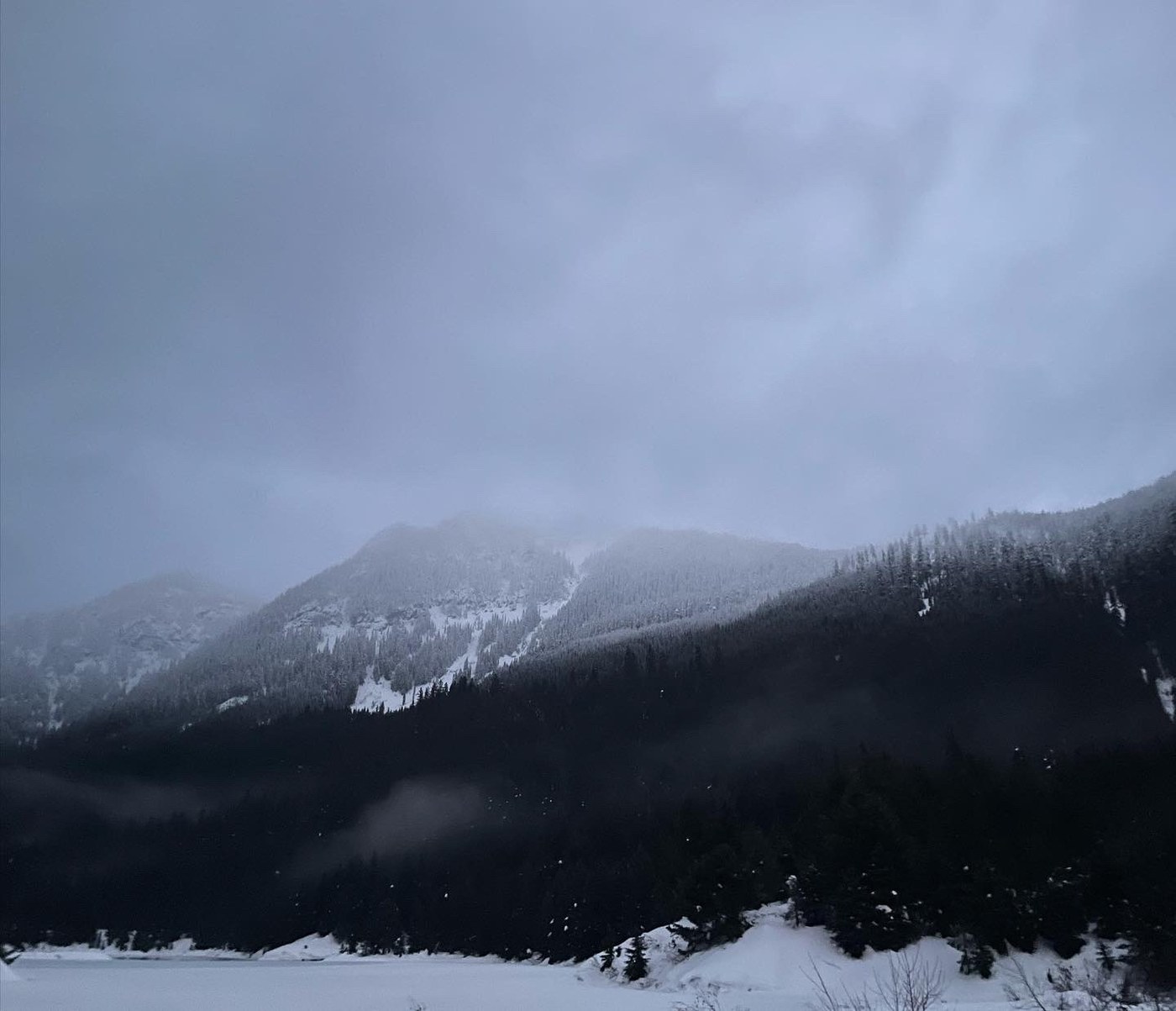The road at the Sno-Park was a mess of hard ice, slush, and deep sloppy meltwater. I’d definitely recommend you have good tires right now. We didn’t try to use the porta-potty at the trailhead; we always stop and use the WSDOT restrooms at the pass; that parking area was even messier than the sno-park, though, so be warned.