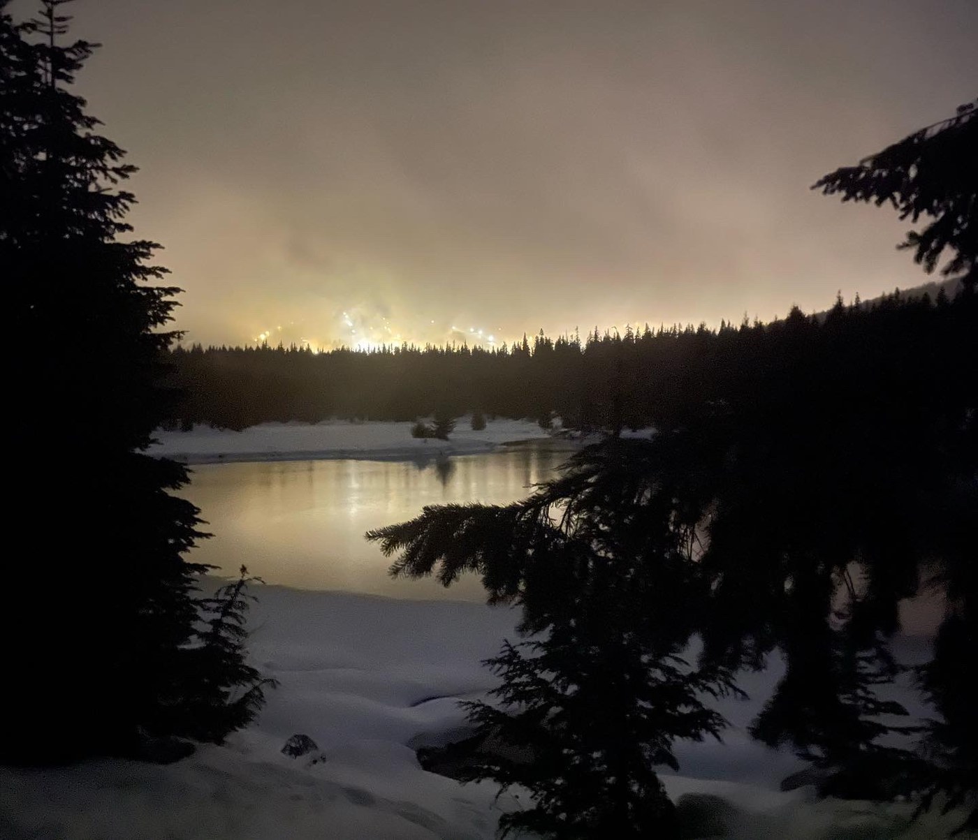 The view toward the ski area is pretty with the lights reflecting off the pond, and a warm glow brightening up the dreary clouds. The moon even tried to make an appearance at the end. We continued trudging through cold ice rain, more snowflakes now filling in the showers. I was really regretting forgetting to pack a change of clothes for the car ride home. But the fresh air and good times with friends were worth the discomfort. We made it home with plenty of time to warm up before watching the fireworks at the Space Needle on TV.