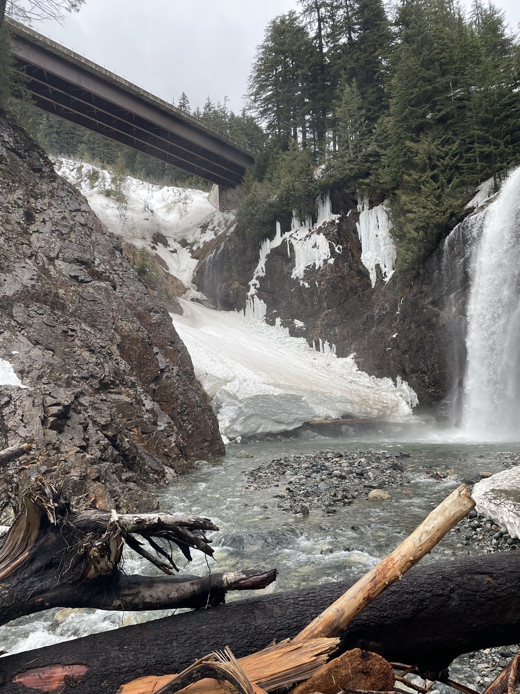Today we hiked to Franklin Falls for the first time. The road portion for the hike was completely clear until a bit before the Denny Creek campground. Then it is pretty compacted snow. We used snowshoes, but most people we passed seemed to be doing just fine with microspikes. Trail is mostly in decent condition, although there were a few bridge crossings with only a skinny walk space due to the snow. The end of the trail is a bit sketchy to get down closer to the falls. It’s very slippery and has limited room to maneuver.