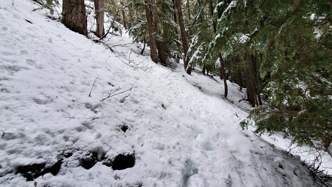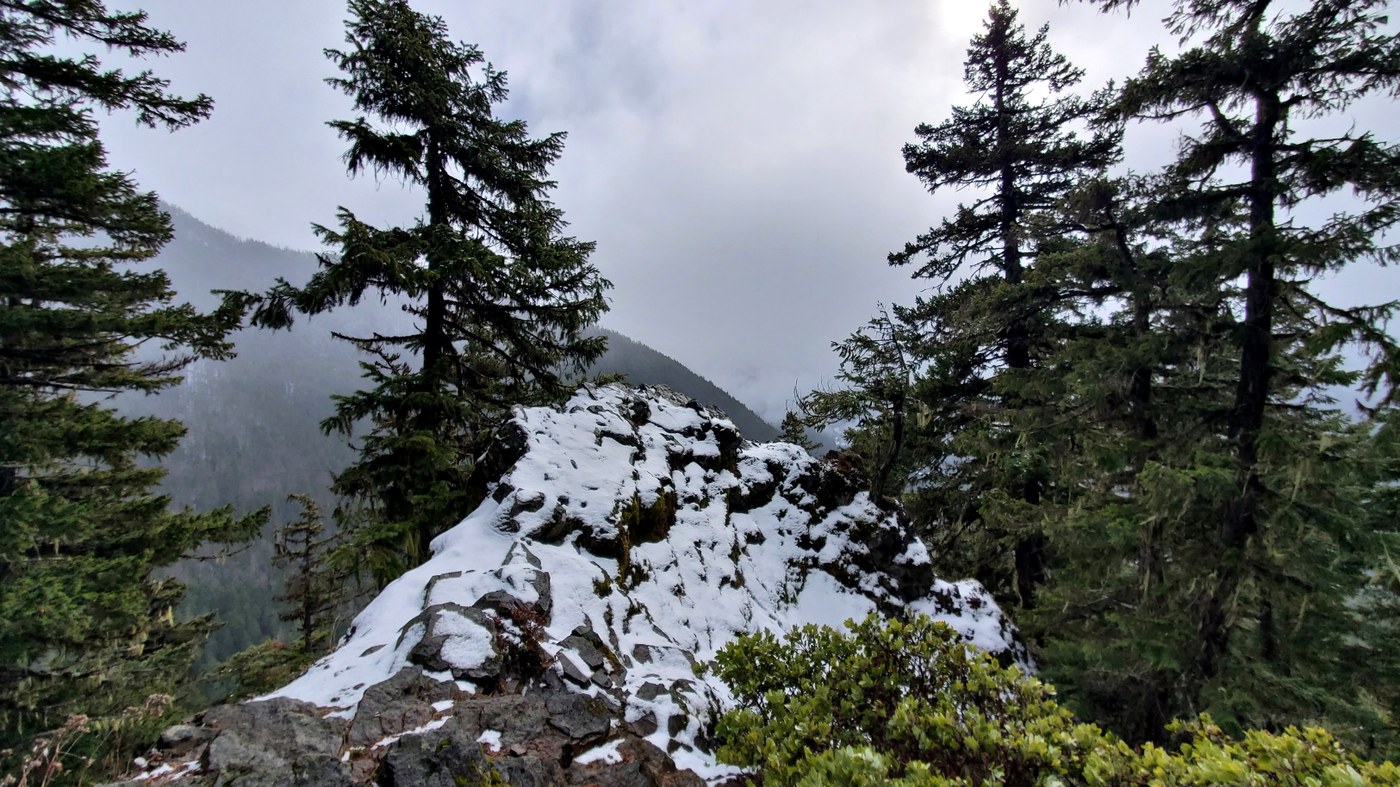 Parked along 410 and caught the White River Trail to Ranger Creek. Trail is mainly snow free up to the viewpoint. Just a dusting of powdery snow which must have been overnight as the ground below was frozen. Poles did manage to grip and even stick a bit in the hardened terrain. A few minor obstacles along the way - one tree had a notch cut in it which made footing great. Didn't expect to see anything from the viewpoint today but we stopped anyway. A big blowdown right above the viewpoint requires a diversion above the exposed roots - maybe 25 feet off trail. The snow begins in about 0.3 and by 0.5 miles is several inches deep with ice below. We didn't use traction and had no issues heading up. The snow is hard and you stay mostly on top - no snowshoes needed. Water was dripping onto the trail from the branches then we experienced frozen rain, and finally snow. We turned around 0.7 from 1198 junction, but not because of the trail. Heading down we slipped several times on the snow-covered ice, but never fell. Poles were helpful and spikes would've been unnecessary.