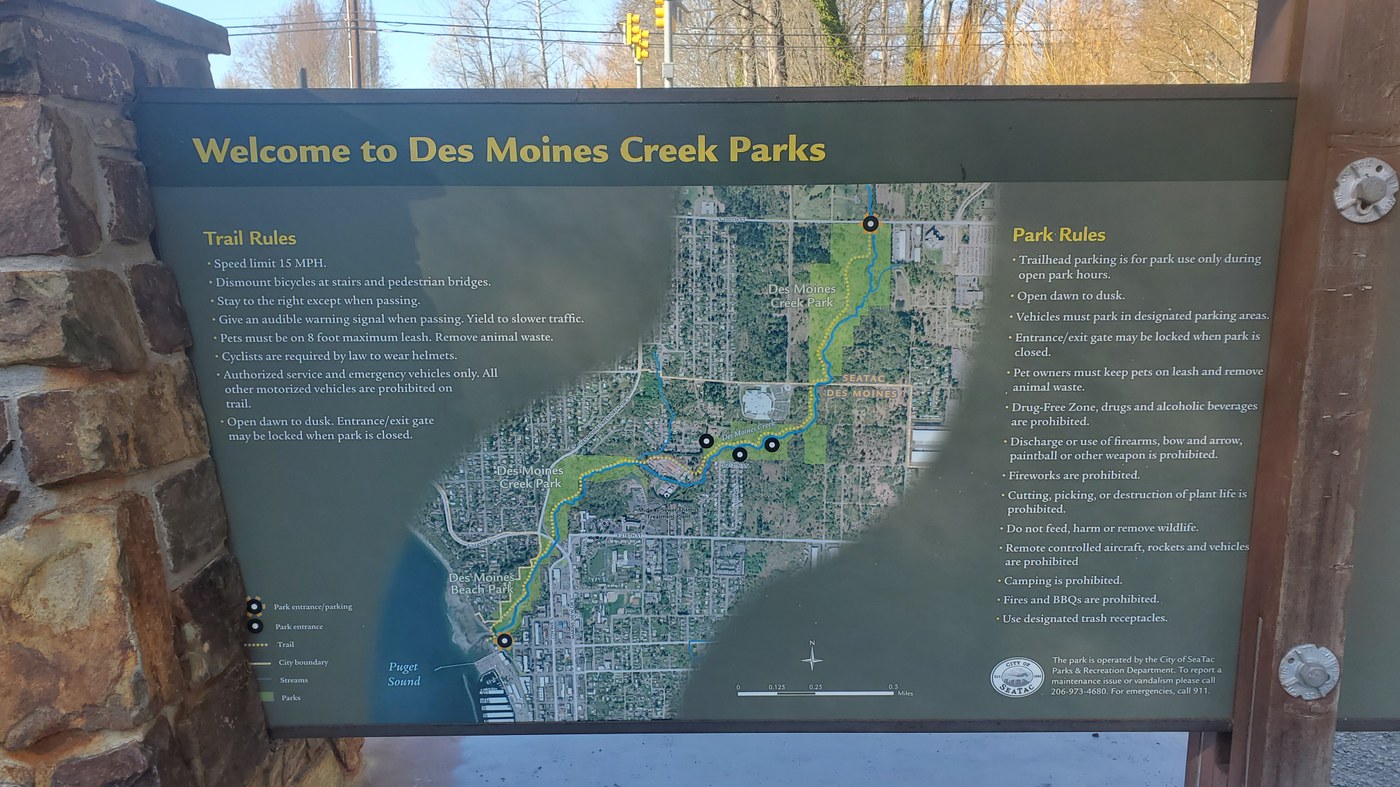 This trip report is intended to help anyone who is visiting Des Moines Creek Trail as a wheelchair or powerchair user. It is written to highlight and make note of accessibility aspects. It was my wife (who is a powerchair user), her service dog, and myself on the trip.