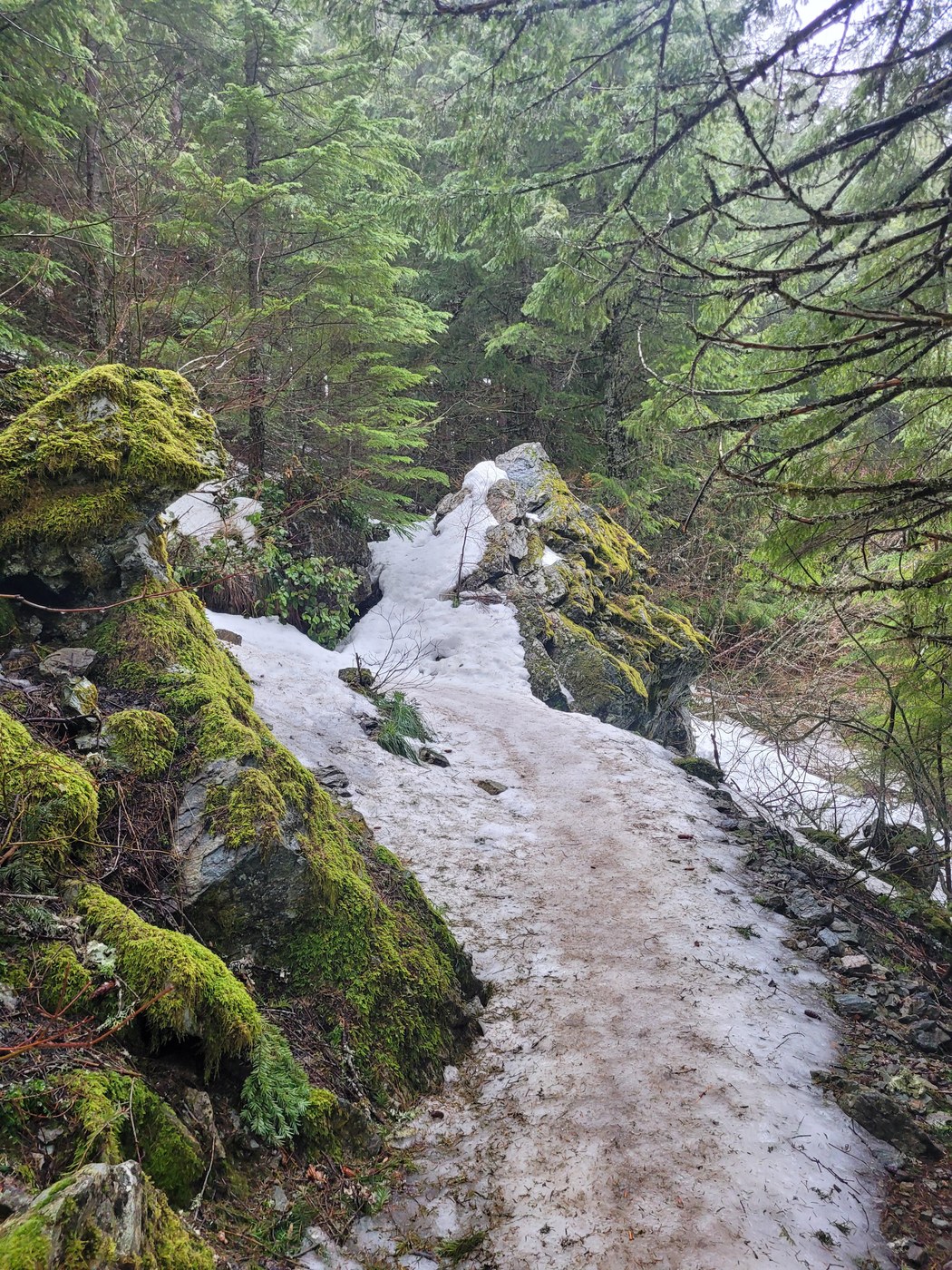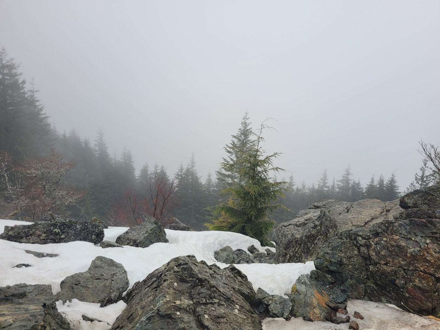 Speaking of switchbacks, that's all the ascent really is! I fell into a plodding rhythm eventually, until I hit the trail snow about 1 mile from the summit. I thought I might be able to manage with just my hiking boots, but 15 steps forward proved me wrong, since this snow is more ice than anything. And on a steep slope like this, that's a treacherous combo- so I donned the spikes. Make sure you do as well! Even with the spikes the icy climb was a bit unnerving. I ended my ascent where the trail tapered off, and where the scramble up the West Chimney Rock begins (I wasn't keen on scrambling up this in the wet and cold) Unfortunately, I was well above the clouds, so there were no views to be had! I'll need to return when visibility is better. So I lunched among the snowy rocks while fending off aggressive Canada Jays, and was getting chilled very quickly, so I started my descent via the 'Old Trail' --> Douglas Fir Trail. (Almost no people on this route).