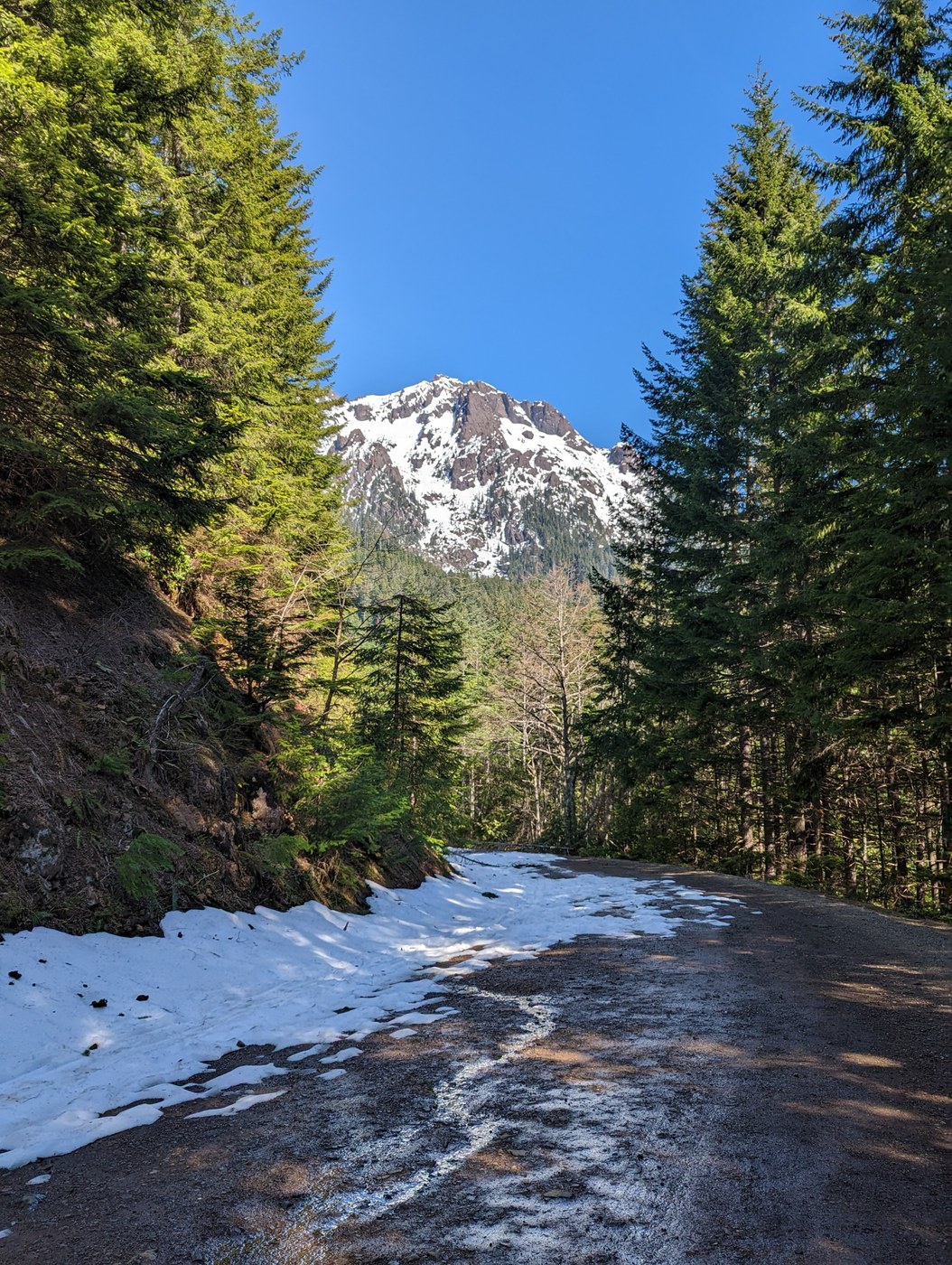 Vehicles are coalescing in the same spot about a mile from the lower TH. It was quickly apparent why: the road, though snow free in spots, still has a fairly deep snowpack for low clearance vehicles with a downed tree that high clearance likely won’t make it under. That combo makes the wisdom of the crowd evident. Park where you see everyone else parking.