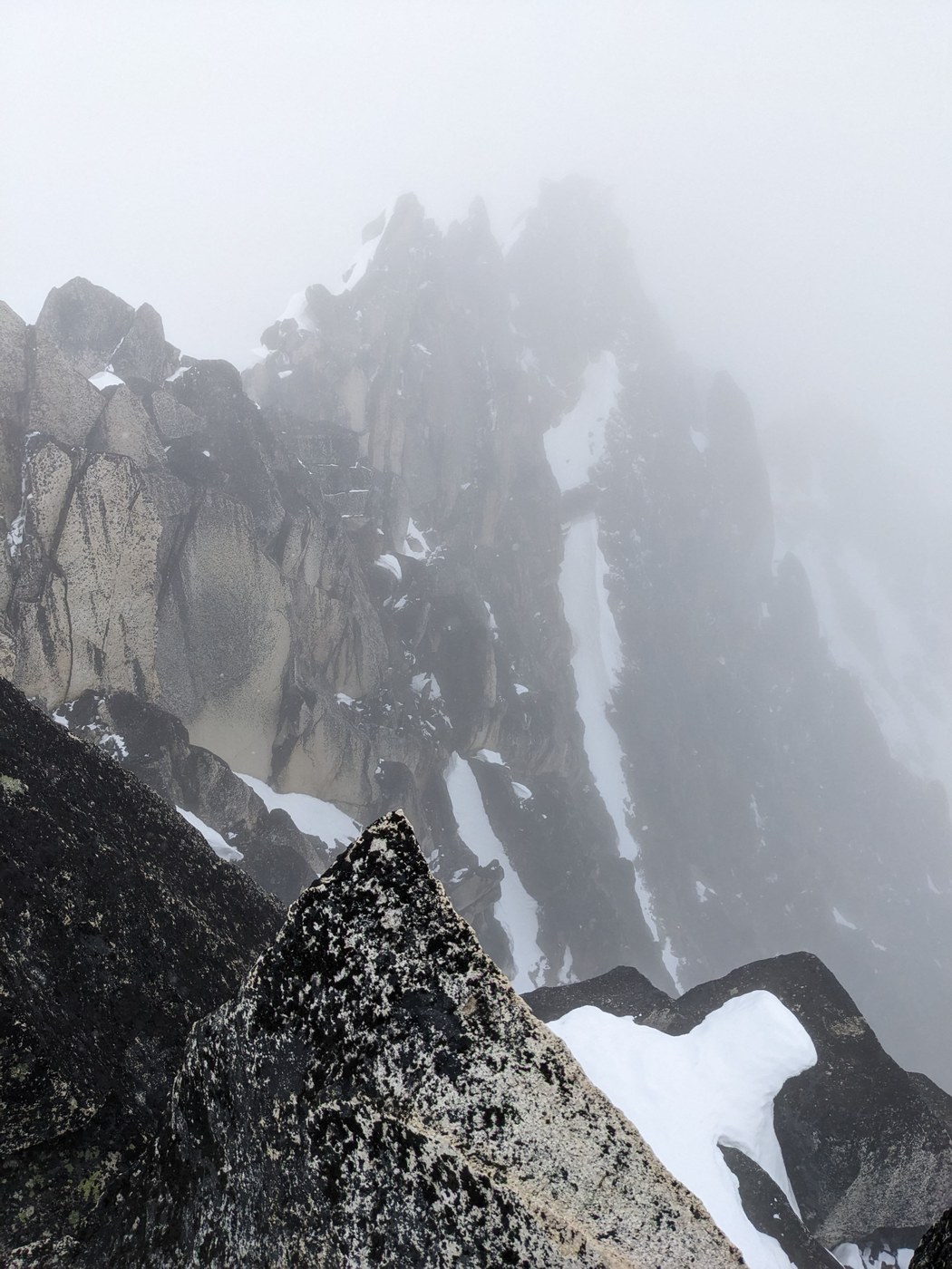The summit block was partially melted out. I swapped out snowshoes for crampons. The snow was not great - I wallowed thigh deep through a few spots. The crampons were 100% not necessary, and definitely made for some awkward scrambling on rock for the last 20-30ft. But I made it!