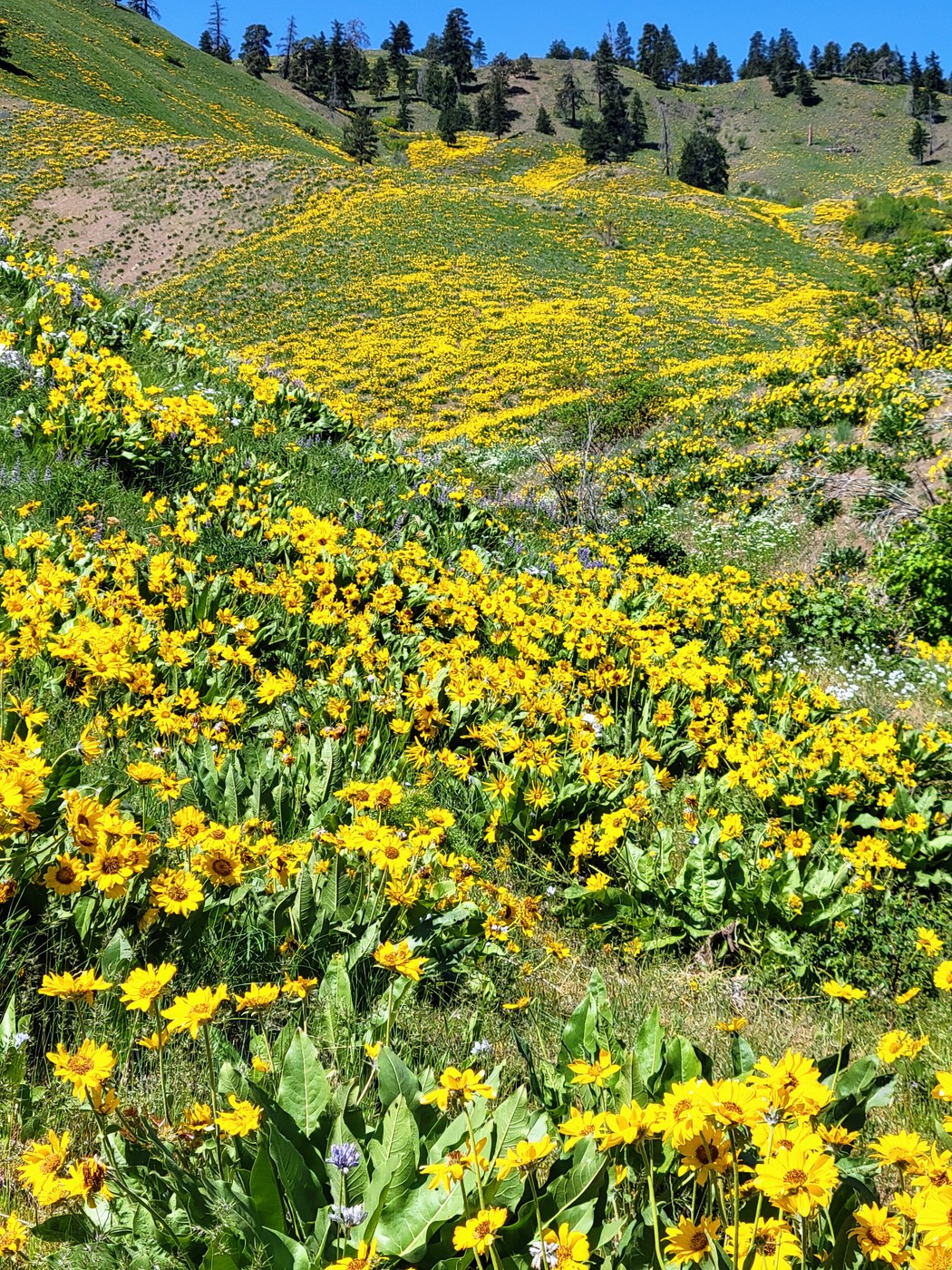 Trip reporters are in the know and there are going to be some of them at one of the premier wildflower hikes in the state, on a weekday, when there are great blooms and perfect sunny weather. A big camera is often a tell. One of these days I am going to get a button made using the design on one of the stickers that WTA sends to trip reporters. :-)