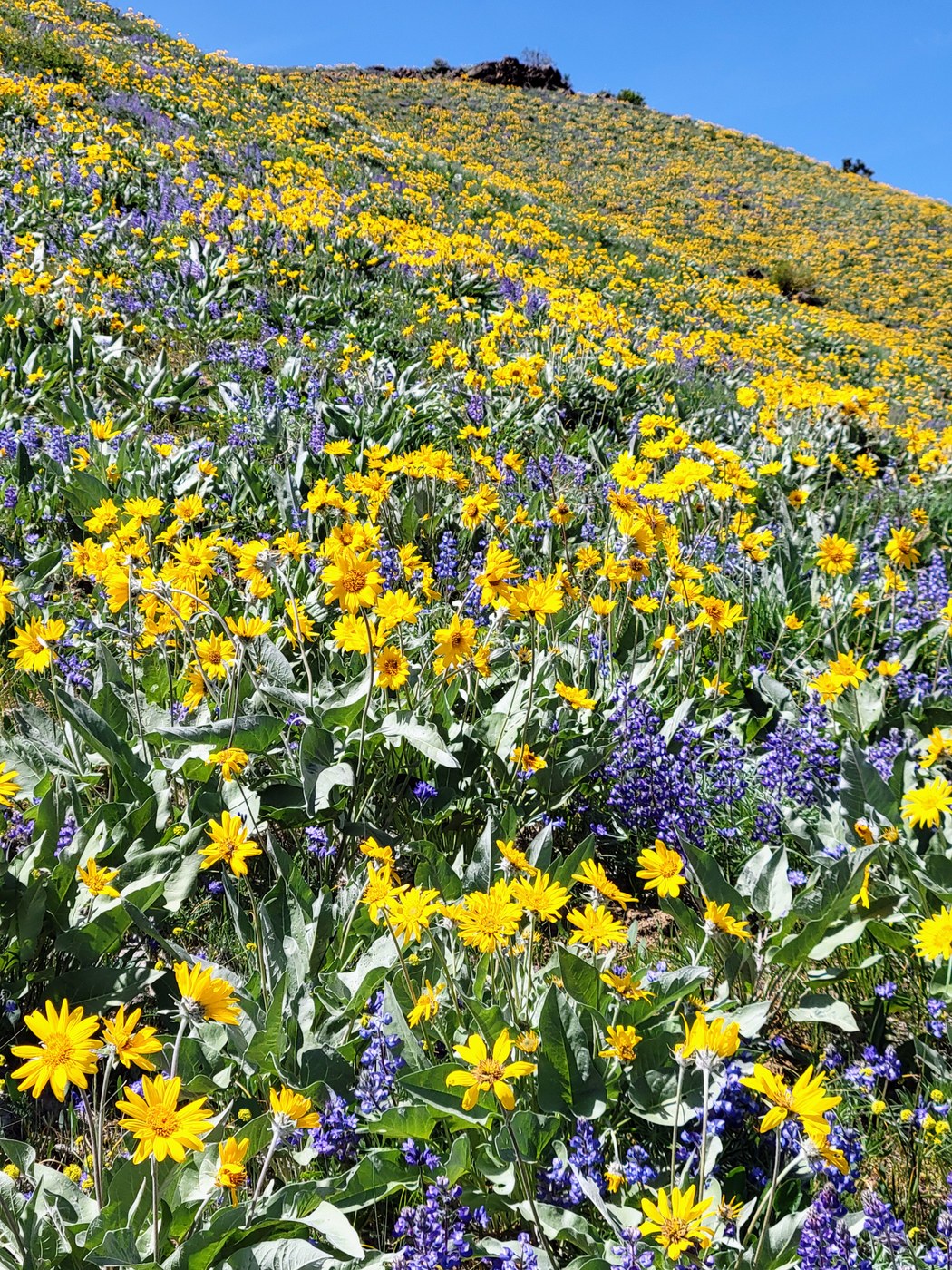 The wildflowers were very thick after the initial ascent from 97A, balsamroot, lupine, phlox, tritilia, groundsel, desert parsleys, stickseed, and more. Butte-Candle (aka northern cryptantha, Oreocarya glomerata) and the white-yellow larkspur were new to me and beautiful. Mills Canyon Road had many Tweedy's Lewisia in bloom and a whole hillside of Snow Douglasia. There were many other flowers on the way up and in the canyon. It's easy to time the flowers here, when Horse Lake is very good, this is very good.
