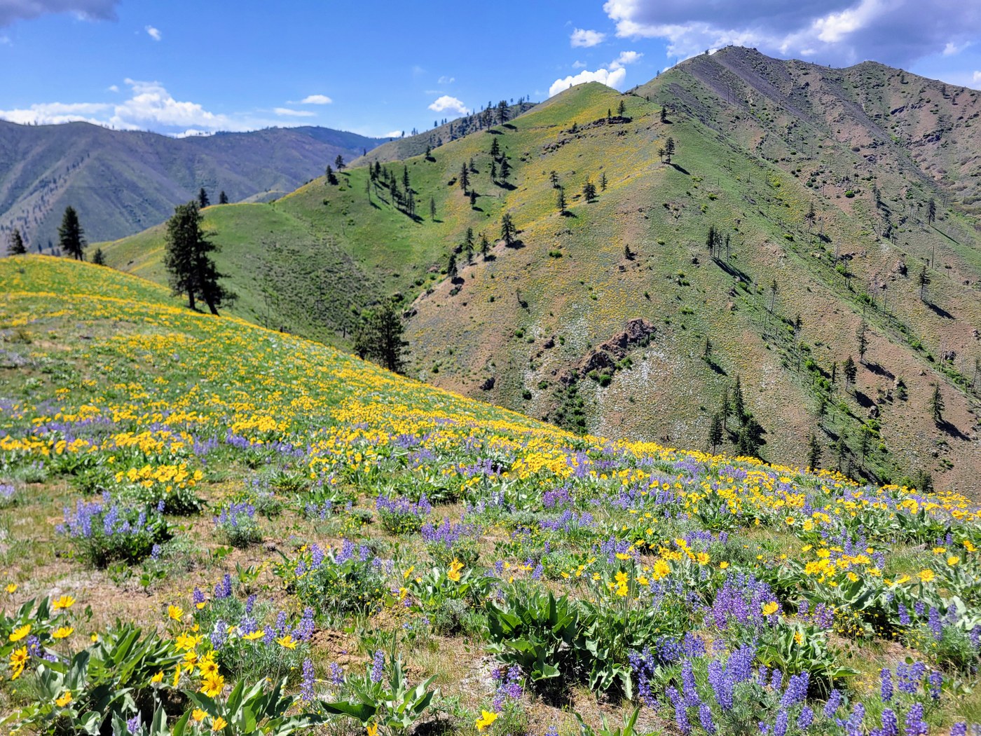 A group of 4 Mountaineers did a point-to-point, car-drop from HWY 97A up to Keystone Point and then down the Mills Canyon Road. A close approximation of our route is the attached caltopo route. Our starting point is the attached google maps link. Our ending point (where we left a car) was just inside/south of the cattle guard (there were some jaggedy rocks beyond this). Up to Keystone is a boot path 25% of the time and then walking through wildflower fields along obvious, rounded, ridge lines the rest of the time.