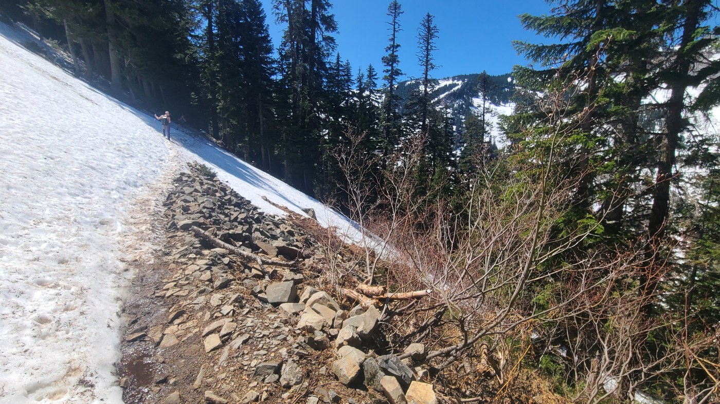 Snow on trail about one third of the way. Several trees down, all crossable. There are several steep "avalanche shoots". I was not concerned about the avalanche possibility but the trail in these areas is snowy and very narrow. A mis step could result in a life threatening injury. If you have a fear of heights, I do not recommend this trail at the moment. I felt better crossing these with my spikes on and a trekking pole with a snow basket. Snow and ice still on the lake.