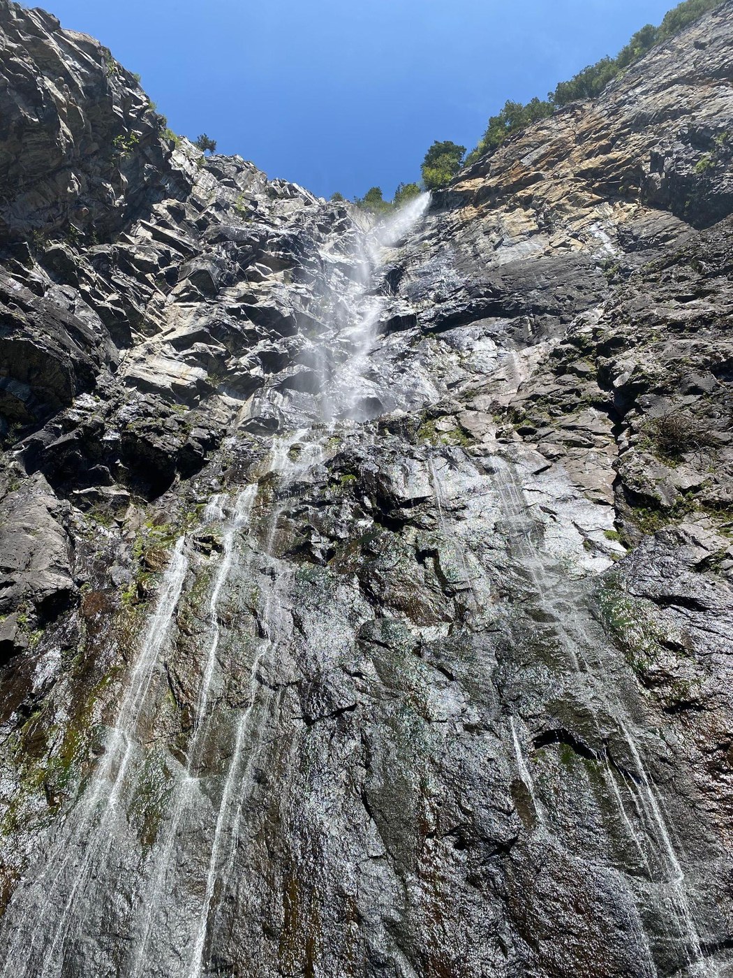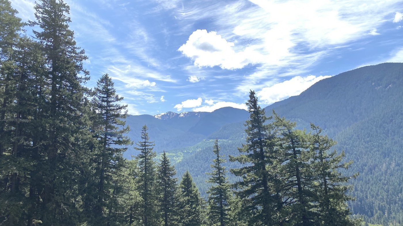 We arrived about noon to a half full parking lot on the Memorial Day weekend Sunday. We hiked the loop in a clockwise direction to do the rocky left side of the loop in the uphill direction. My knees appreciate the softer trail on the right loop in the downhill direction. The trail is mostly shady but with several open, breezy viewpoints on the left loop. There is a scramble straight up to the base of the falls and poles were very helpful on the way down. At the falls the wind would occasionally catch the water and send the spray sideways for a cool effect. Crossing the creek was very easy today but I think I will try this hike earlier in the spring for a higher water volume. At the base of the falls there would be a peek-a-boo view of the summit of Rainier but the only cloud in the sky obscured it today. We drove up to Chinook Pass after the hike for better views and to see the snow there. No wildlife on the trail today but saw one Elk in the river near The Dalles campground, a herd close to Greenwater, and (no kidding) a sunglass wearing Sasquatch by Federation Forest. He was friendly and waved when I honked. I wish I had a dash cam! Huckleberry shakes at Wapiti Outdoors finished a great day.