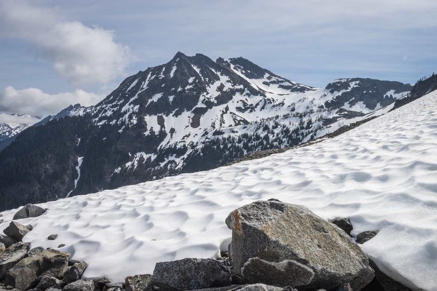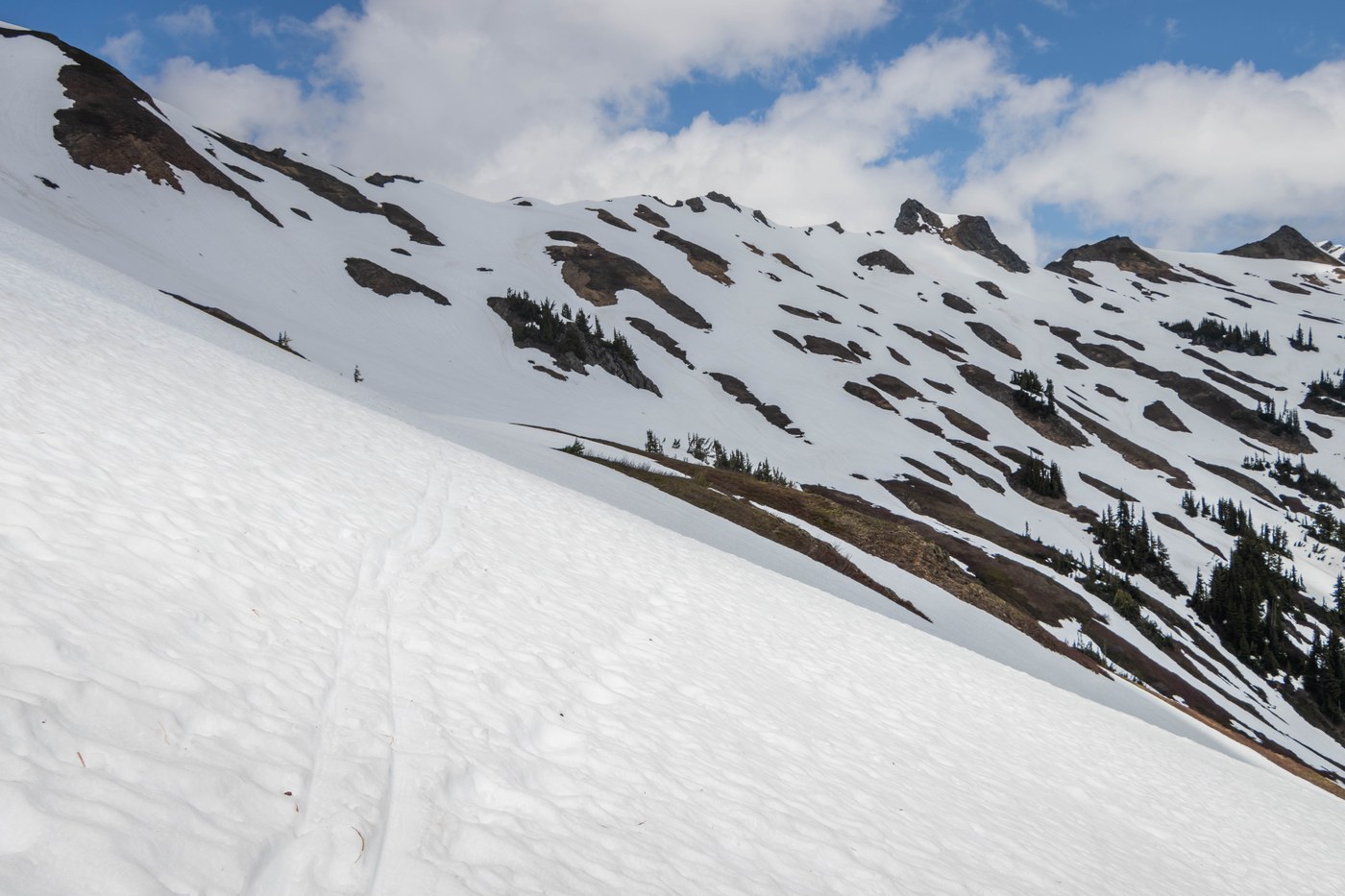 - Three patches before the initial full view of White Pass were pretty airy. I noticed spike marks on the uphill side; glad people used ice axes! Some parts were slick due to the slush; proceed with caution.