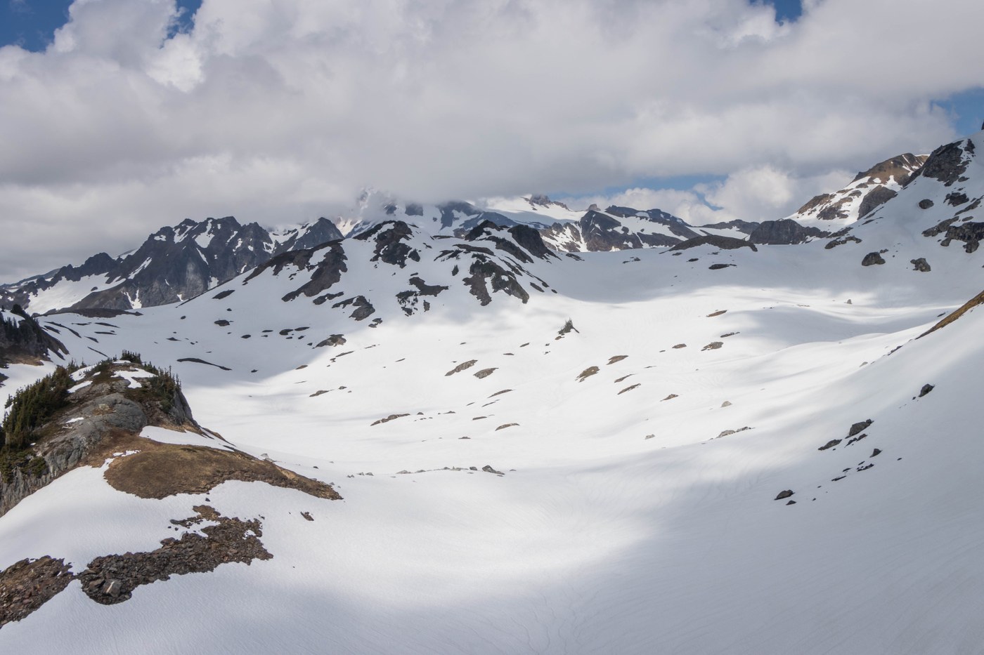- We took the saddle west of the high point in the snow and descended steep terrain into the basin.