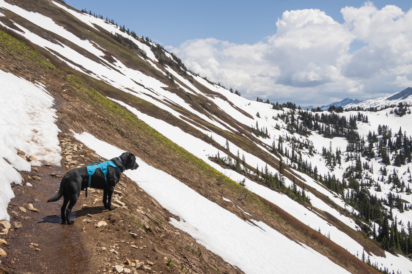 - The first few patches over the trail were with less exposure. As the trail climbed through the broad avalanche gully, the exposure increased.