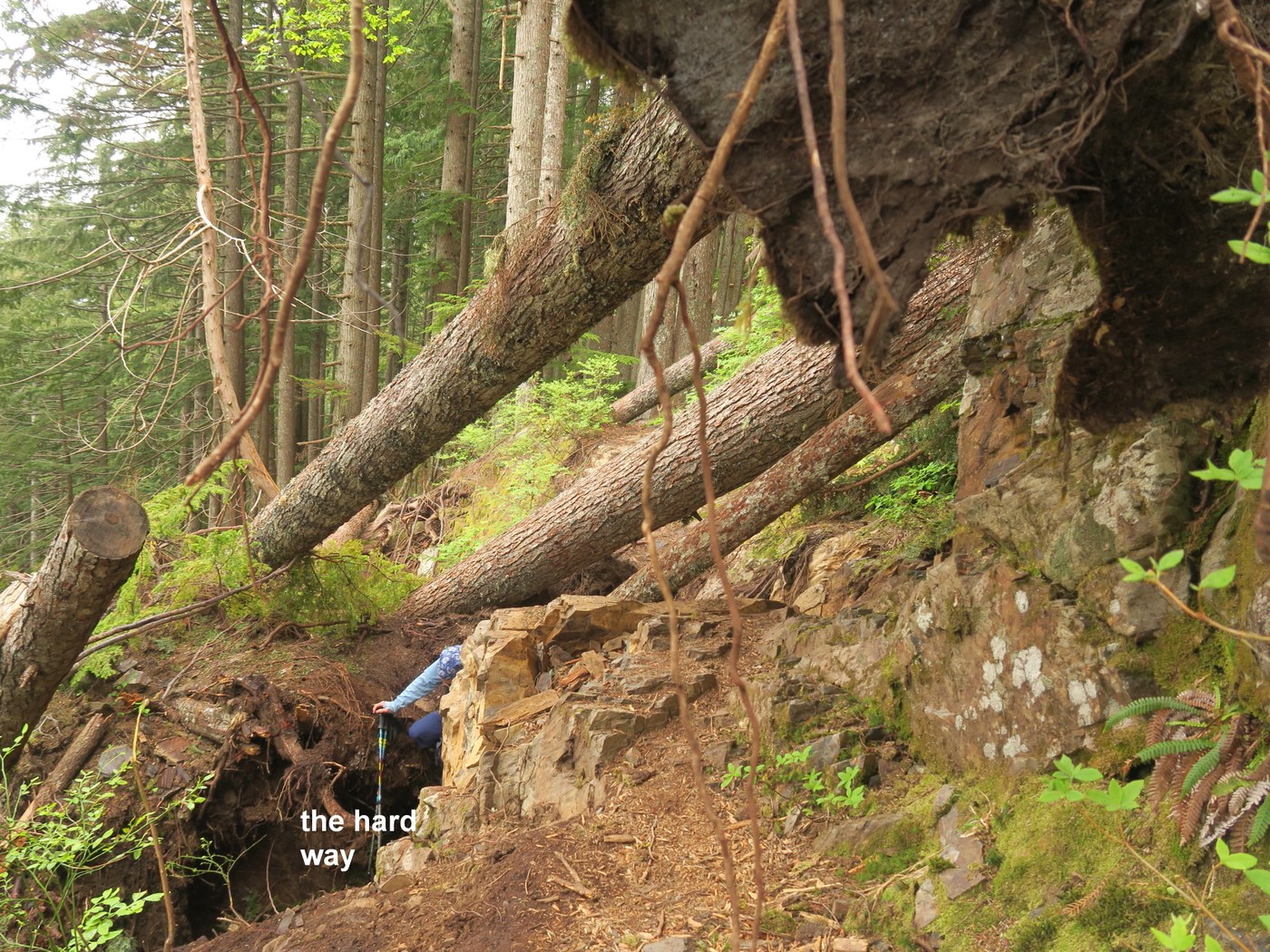 No, the hiking grandmas didn't go to Boulder, but I do have a bit of info after talking to a hiker that had been in there, I'll post it at the end. This is for Greider and I'm going to give a bit more info on this trail than previous reports have. The road to the TH is paved and then good gravel, loos are clean and stocked. There are 2 new bridges toward the beginning, but they are NOT FINISHED and not stabilized, so you will still have to cross the creek on some well-placed logs and rocks. There is a picnic table and loo at the Nighthawk picnic area about a mile in. There is a warning at the beginning of the trail about a nasty blowdown 2/3s of the way up the switchbacks, it is no joke. This is one nasty jackstraw mess of hanging root balls, crossed logs, rock and mud. Clearing this up will probably require a professional sawyer, chain saw and perhaps a stick of dynamite, plus a closed trail until it's done. I've been on enough work parties to know this is a dangerous logout. Meanwhile, you have to navigate your way thru it. I posted a picture and a bit of instruction on how we did it. I did flag a few spots so we could find our way back down easier. Some hikers cut thru the brush, but I feel that just erodes the trail and not a good idea. Deal with the mud. Once past this one, you have another smaller one to deal with, for that one, just shoot straight up the bank beside it, hand over hand up, dirt glissade down for me. Other than the nasty blowdown, the trail is pretty good mostly, but toward the top it is a bit of a rocky rooty mess with rotten, falling apart stairs that are more hinderance than help. It's also a tough climb, I freely admit this trail was hard for me, but I'm old and ornery. We had no views of the lake and were running short on time, so we bailed on Big Greider today. The loo at little Greider is a biohazard. Why does the DNR go to all the trouble to put these in and then not take care of them?