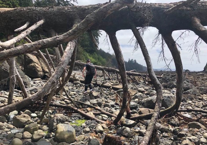 After taking a bit of a detour north to Cape Alava, we set off south down the beach. Very slow going with rocks and soft pebbly beach sections. Millions of little crabs skittering around. Lots of downed trees to go over and under in the first mile or so.