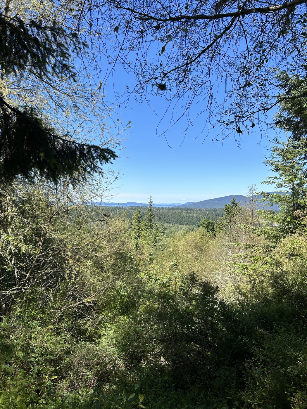 About halfway up the trail, there are two benches next to a small clearing that offers views to the Northwest of Guemes and several other islands. The foliage becomes much more open as the trail ascends past this lookout. The forest thins out and the trail becomes much more exposed to the sun, and the grade becomes steeper in places.