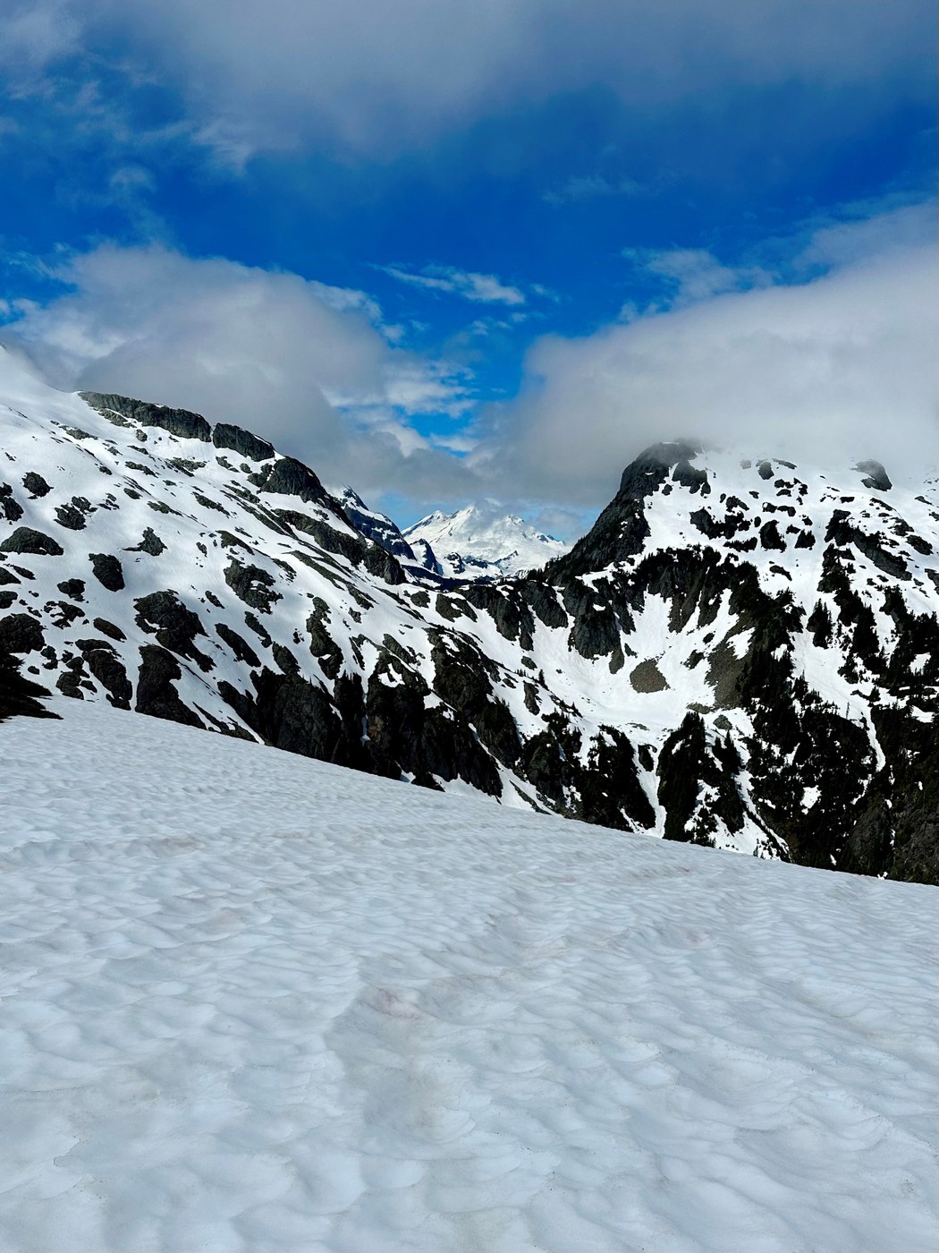 Beautiful day to be in the Washington Alps! We arrived at the TH around 6:30am and the parking lot was already full. A few bugs swirling as we were getting ready but they weren't bad. Hike up to Hannegan Pass was absolutely beautiful - waterfalls and snowcapped peaks everywhere you turned. Snow started around 4 miles in and persisted at 4.5 miles in. Our group did use crampons in the morning and we did rope up to Ruth (mostly for practice) but it was soft and slushy on the way down. Lots of different water sources on the way up and a few clear campsites at the summit of Ruth and just before the final 1,000 of ascent. No open crevasses that we could see and it was snow free at the summit. We clocked just shy of 13 miles RT and about 4,600 ft of gain.