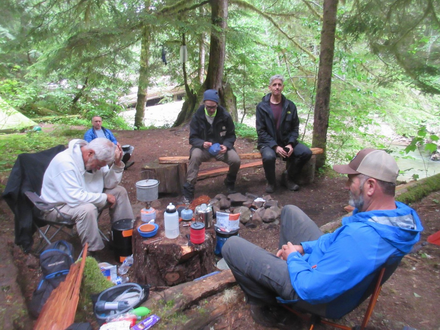 The WTA crew camped about 2 miles from the trail head. These hard working volunteers were supported by equally hard working BCHW horse riders, leading pack stock carrying camping gear, tools and decking planks. The most appreciated cargo was the large BCHW lunch sandwiches and snacks the packers carried into the work camp each day. At 11:30 each day, everyone typically looked at their watch in hopes of seeing the lunch pack train or “Mulligan car” (a cantina wagon located on a wagon or rail car at a lumber camp) coming in.