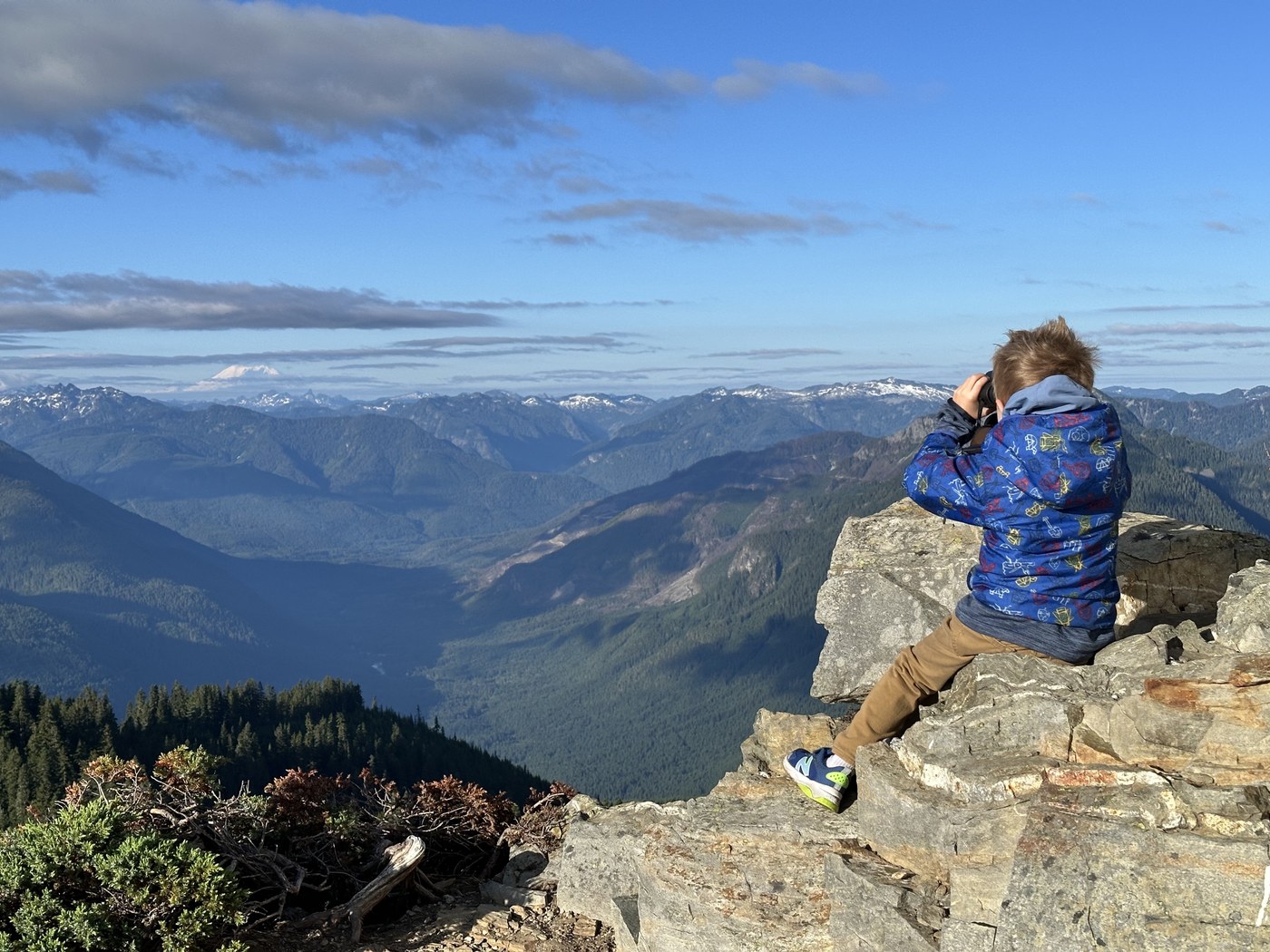 Did this hike today with my six year old, who has little legs but has been hiking with me since he was three. We got to the trailhead just before dawn, air temperature was a hair under 50 f at the trailhead and not more than 60 at the top, and there was just a tiny bit of breeze, and bugs were not a problem at all. At his pace the ascent took about an hour and twenty minutes, and I don't think I would have done it much faster by myself. There were a few small patches of snow left on the trail in the shade. We heard ptarmigans (edit: sooty grouse) well before we saw one at the summit - they sound like much larger animals. The view from the top absolutely lives up to the hype. Descent took one hour.