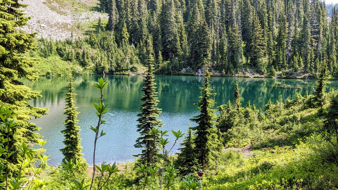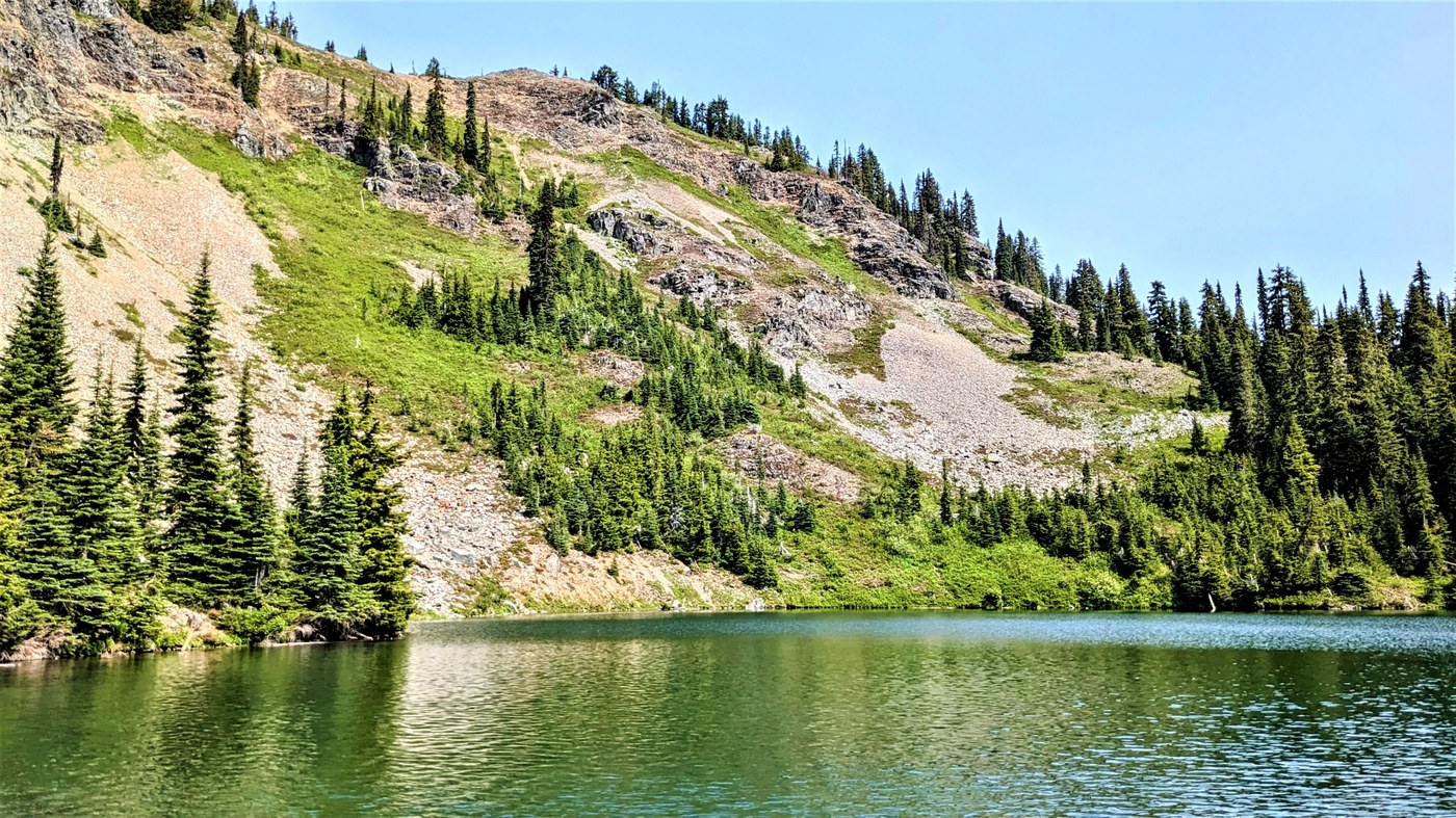 Decided to take my daughter, son-in-law and their dog up to Margaret Lake today, even though I knew it would be busier since it's the holiday. We arrived at 8:30 and the parking lot was full with people starting to park along the road. We did get parking and even though the trail was busier than normal it didn't feel crowded. Everyone we passed were cheerful and friendly with their dogs well behaved too. This is a pretty good up hill trek with views of Rainier along the way, that were so beautiful even if it was a bit hazy due to the heat. Getting closer to Margaret lake, it is down hill into the basin to reach the lake shore, so a real good work out. At the lake shore today the mosquitos were ready and waiting for lunch, so even with bug spray they were bad. All dogs coming through did have to take a dip in the lake, ours included. There were loads of wildflowers along this trail also. A very beautiful trail.