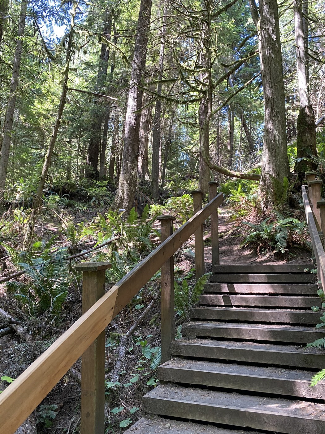 The trail descended gently into the valley and paralleled the stream before climbing a few flights of stairs. The stairs were shallow with a graspable rail so they were fairly easy.