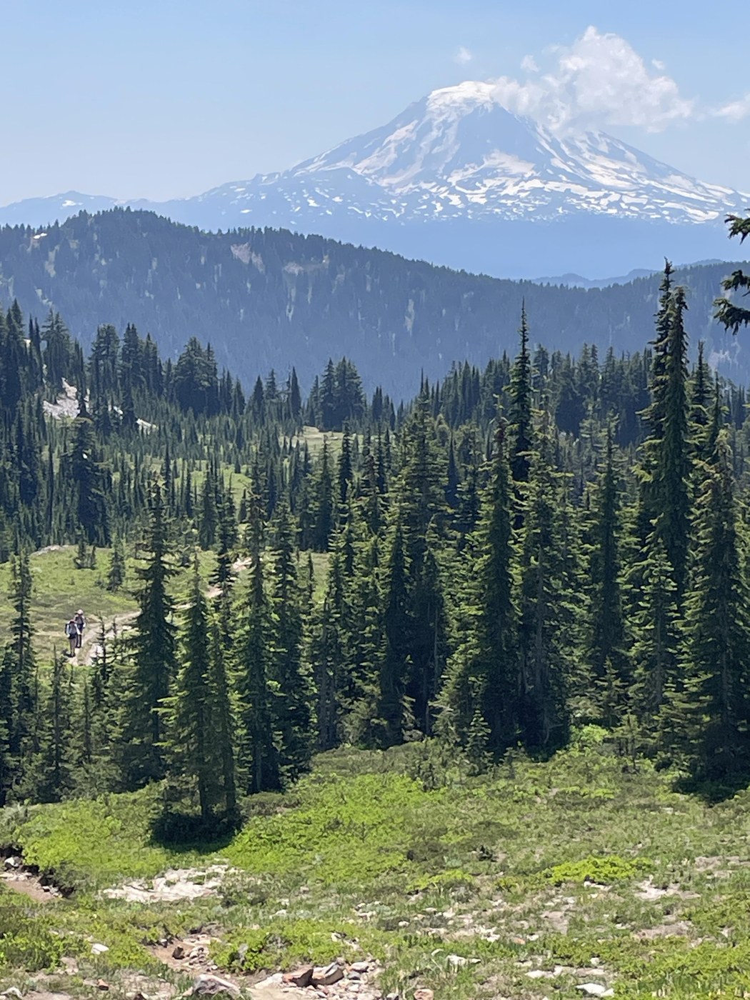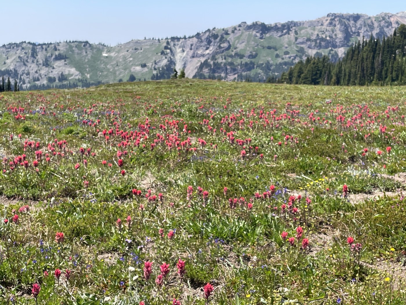 Main attraction- gorgeous views of Mt. Adams, almost exclusively from PCT or the very top of the Snowgrass trail. And the wildflowers were putting on a show. Mosquitoes not bad if you kept moving. I'll plan on doing this again late Summer or early Fall to compare.