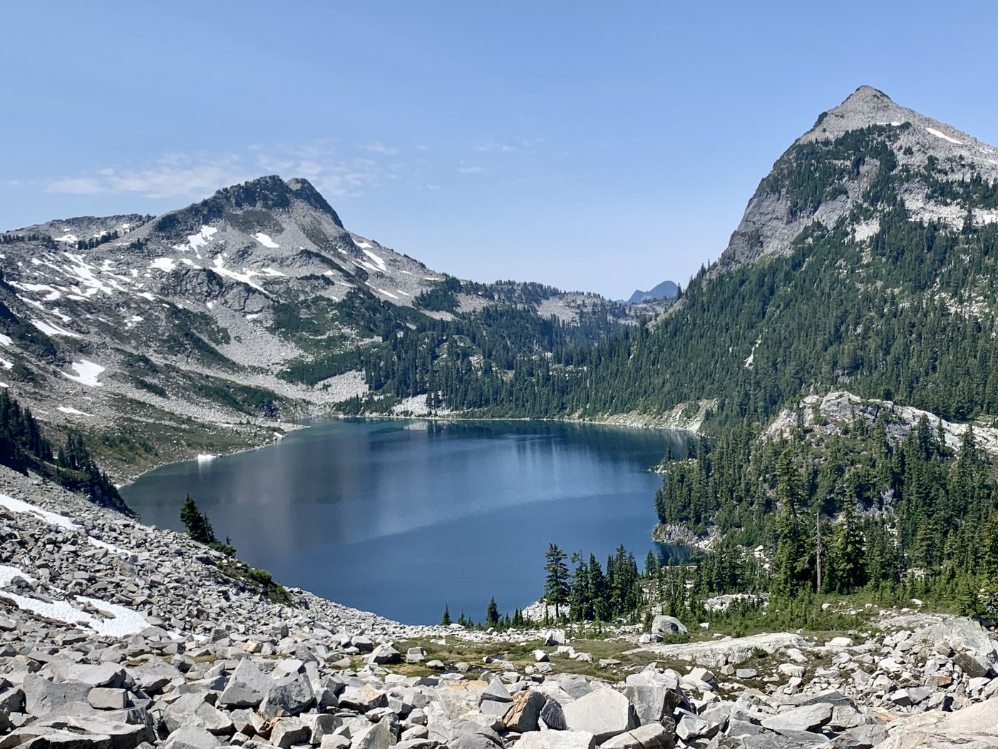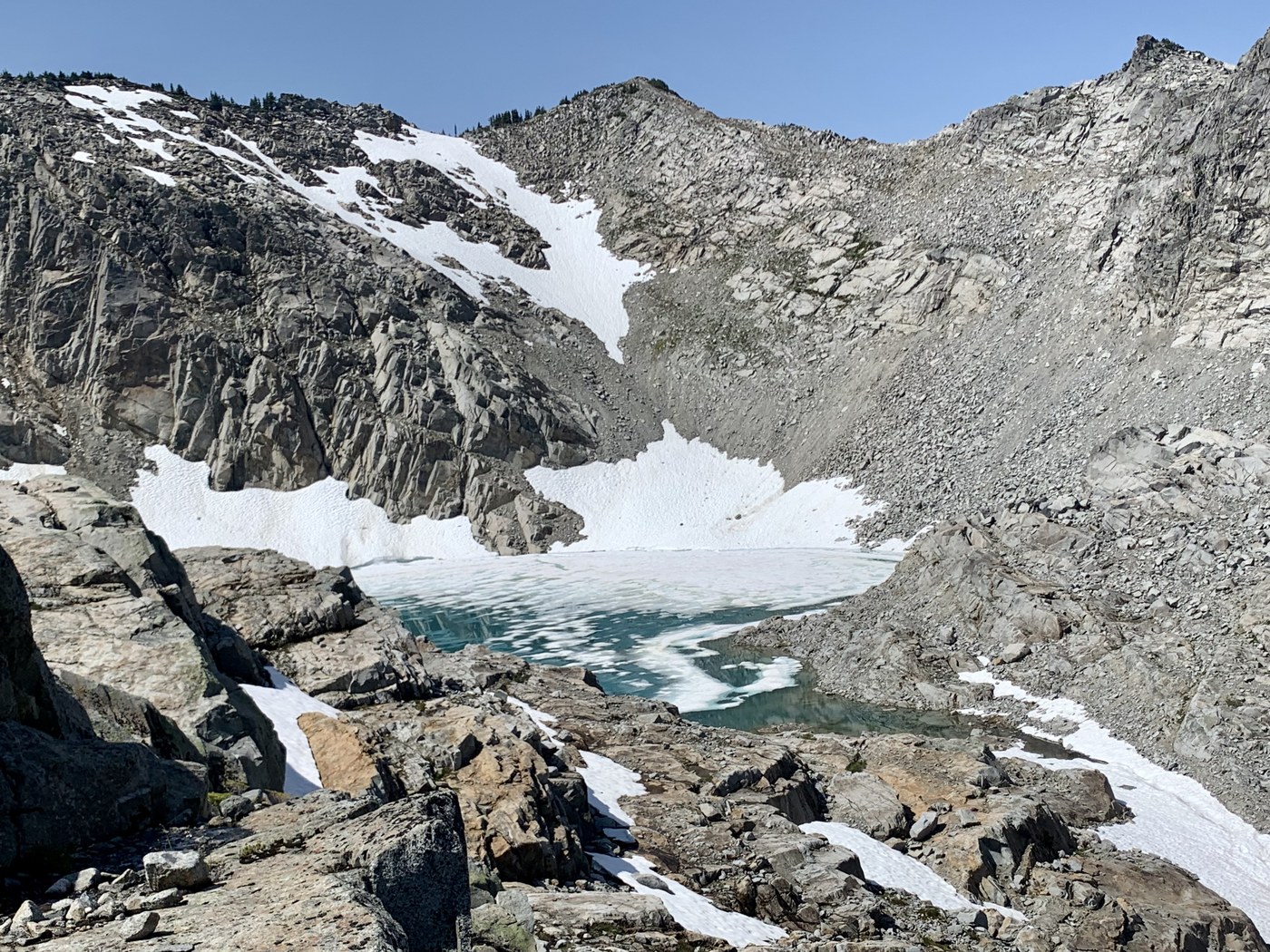 Route finding skills, tools, and experience highly recommended for anyone wanting to explore the area between Tank Lakes and Chetwoot Lake. Minimal snow patches remain, but still some snow to negotiate. Ice ax and/or traction not needed, but best to try and avoid the higher angle snow slopes.
