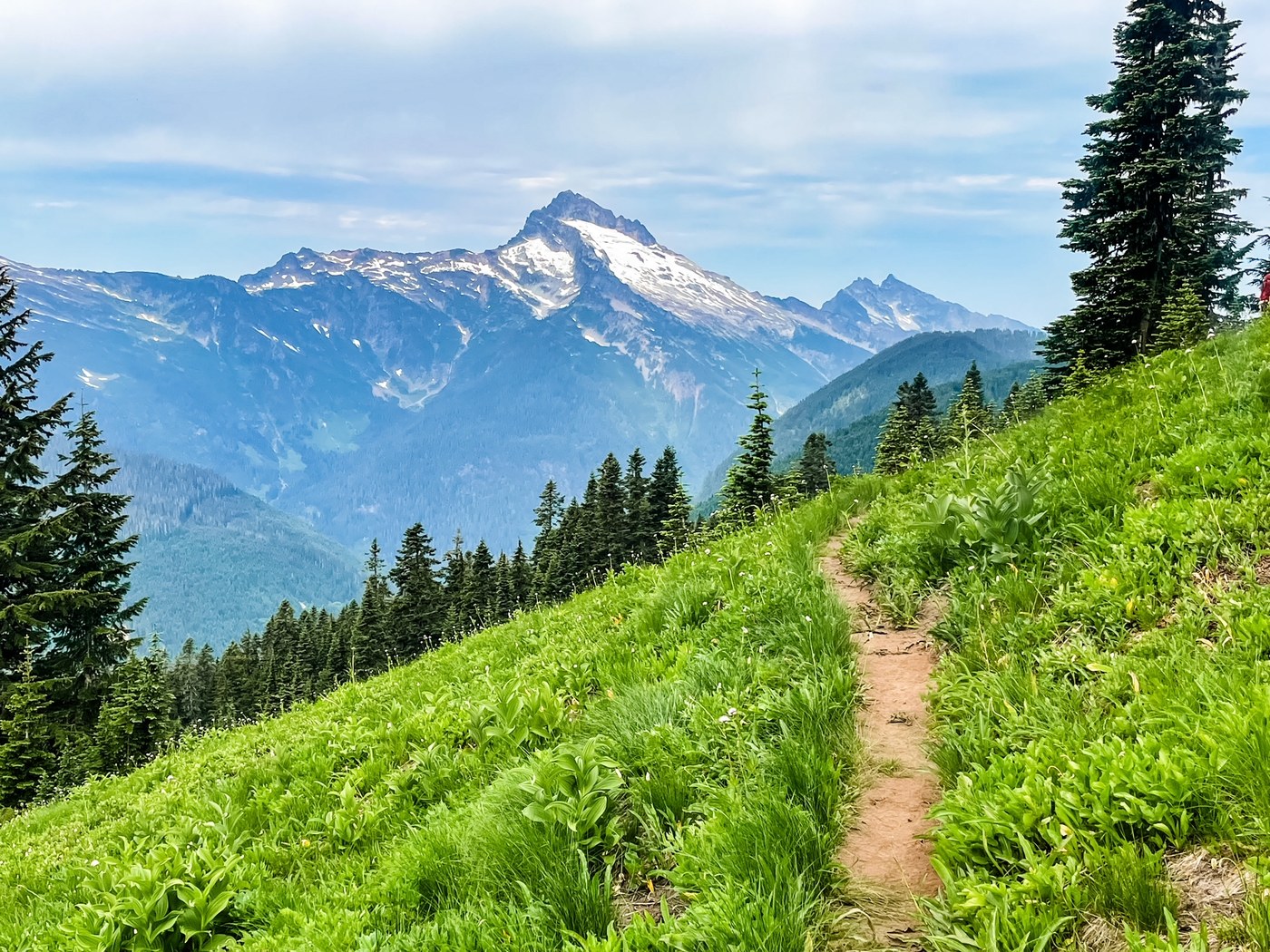 All the trails were in great condition. A little brushy or drainage brush in those areas, meadows were blooming so lots of wildflowers. Pilot Ridge trail was more notably rugged with a few blowdowns and just general terrain was less hard packed and wide, more rocky or loose in the meadows. PCT section was great and plenty of views. Bald Eagle was a climb up, but nice views, took the shortcut trail to the Upper Lakes which was steep and rocky on both sides but doable and beautiful! Overall there were a handful of snow patches still that you can see are melting out below, so use common sense and cross accordingly. Some of them you could navigate above or below if too thin.
