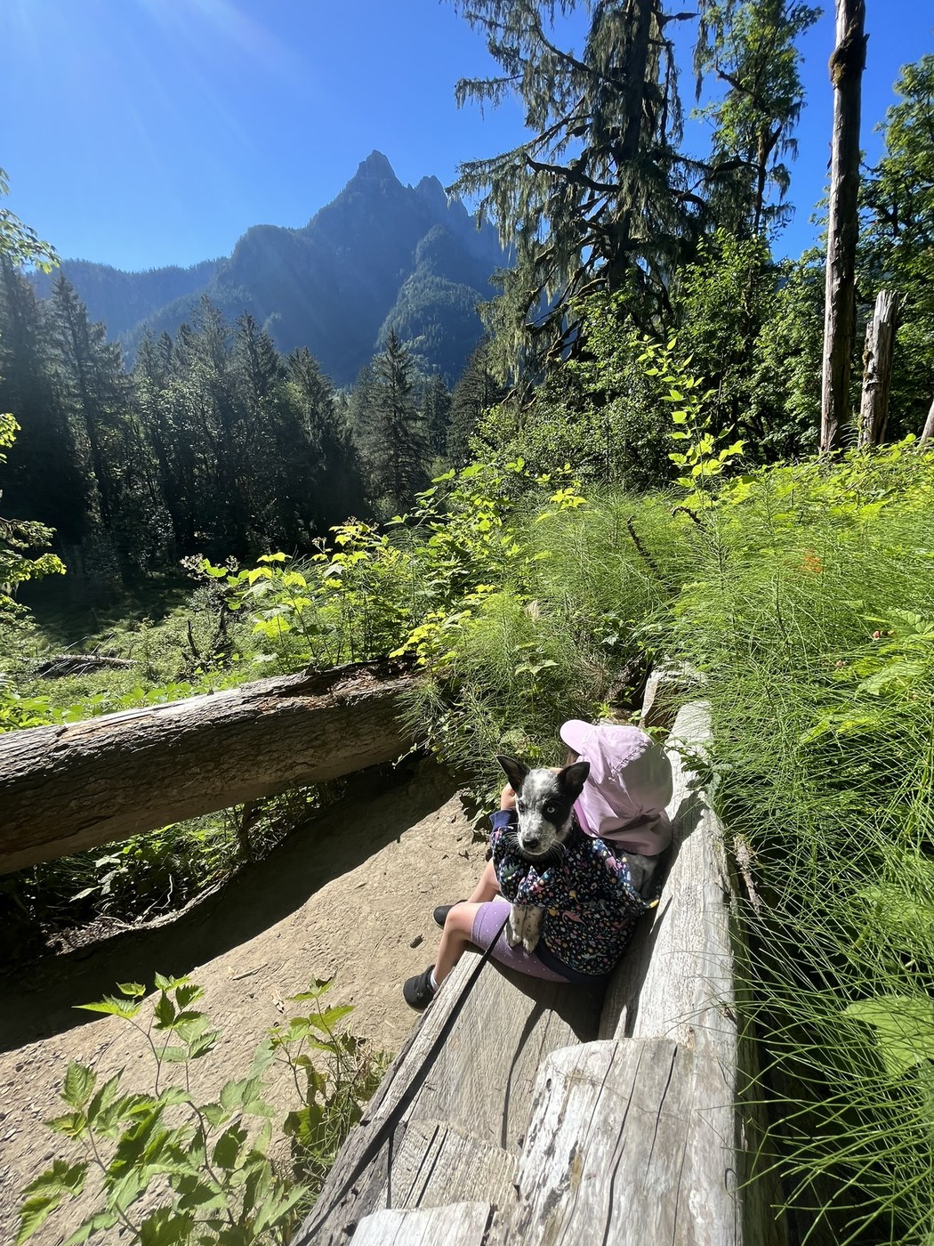 I felt ambitious and took my 3 year old, my 15 month old, and our 3 month old puppy hiking this morning. We arrived at the small parking lot around 8:30am and only 3 cars were there, much to my surprise on a very nice Saturday. Based on the length of the hike and how far down Middle Fork it is, I’d guess it’s not a super popular hike, which means it is my lucky day! The Mailbox Peak lots were already bursting at the seams with cars starting to park along the side of the road.