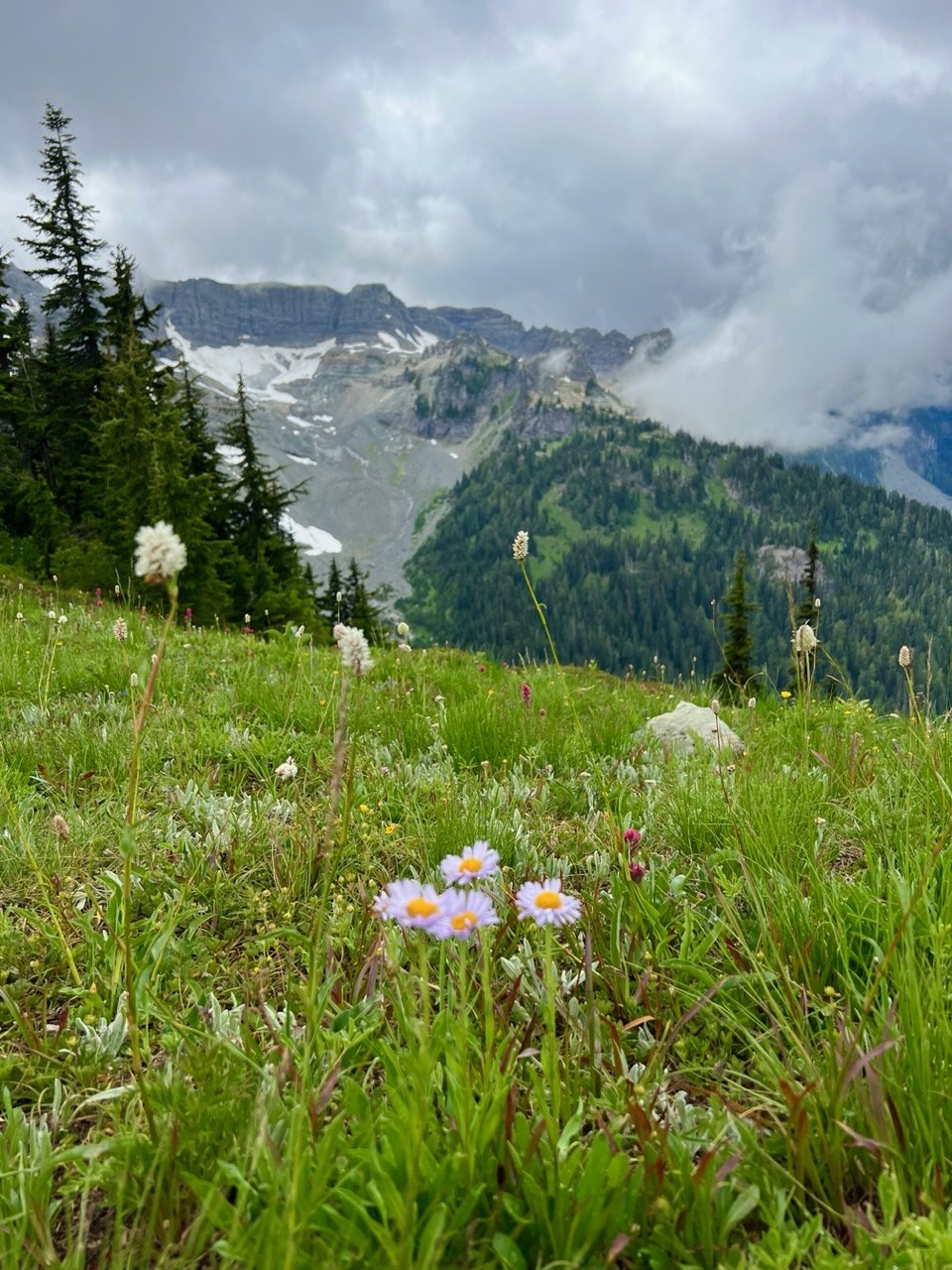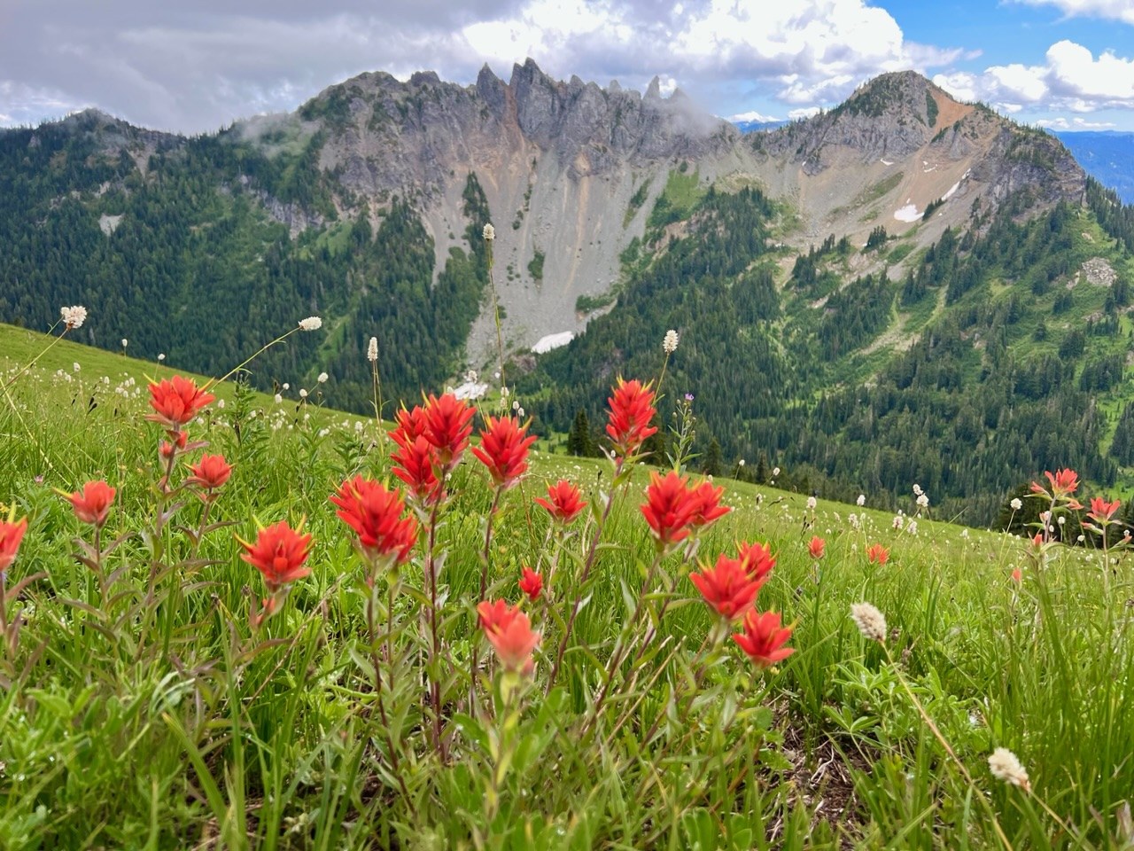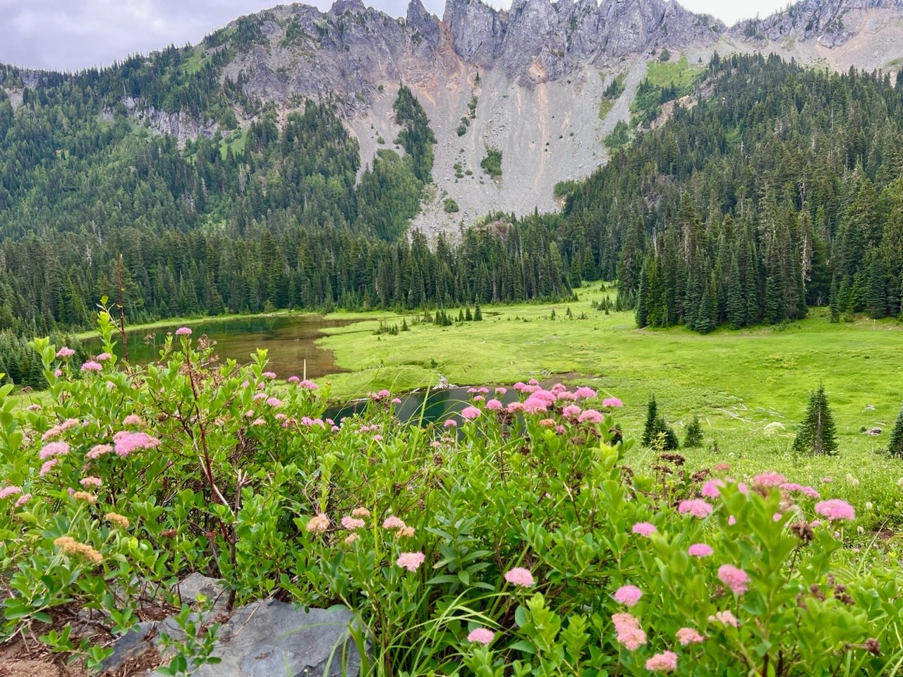 We had a great hike to Owyhigh Lakes and Tamanos Ridge today. After reading several trip reports both on WTA and All Trails several bear sightings were mentioned in the last 2 weeks. We hoped to have a bear sighting but no such luck today. It was overcast and 48 degrees when we pulled up to the trailhead on Sunrise Park Drive inside Mt Rainier National Park at 9:15. We were geared up and hiking by 9:30. No cars were at the trailhead when we pulled up. There is no toilet facility here so plan to use the facilities at the park entrance or Green Door. After the overnight rain the trail duff was slightly soggy in open areas but completely dry under the forest canopy. We had to step over or go around only 4 downed trees on our entire route up to Tamanos. All were easy to negotiate. Wildflowers start when you first step the trail - twin flower, pipsissewa and sidebells wintergreen line the trail on the first few switchbacks. The vanilla leaf and corral root in this section have faded. The real wildflower show starts as you enter the meadow before Owyhigh Lakes. Lupine, Anemone (Mouse on a Stick), paint brush, bistort, arnica, spirea, lousewort, valerian, Columbine and false hellebore keep looking better the further you continued to walk towards the meadow at the bottom of the Tamanos ridge. Trail traffic was super light we saw only 2 groups of 2 the entire day. If you want solitude on a Rainier trail this would be a great option. We arrived up at Tamanos Ridge just before 1:00 after stopping for many floral and scenery photo ops along the way. There were no Rainier views today and we were in and out of the clouds during our lunch rest break. We all started to chill down quickly so add fleece and puff layers so we could enjoy our lunches without freezing. Wildlife sightings included 3 marmots, several chipmunks and squirrels, a lone mountain goat, a grouse with 4 chicks, and a couple robins and juncos. One other couple arrived up on Tamanos when we started our descent at 1:40. Temperatures slightly warmed up to 58 degrees when we arrived back to the trailhead at 4:15. Another fantastic day out in nature with friends.