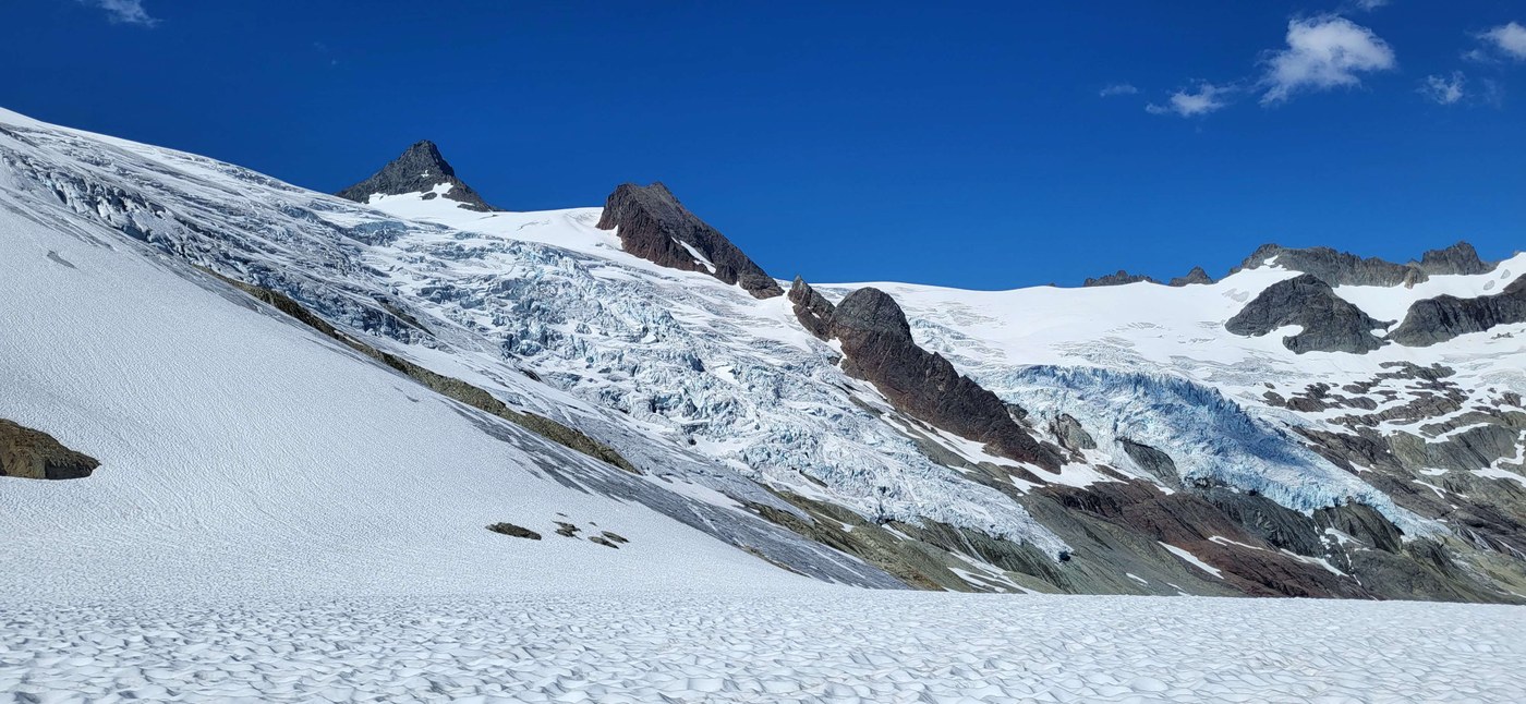 I day hiked from my camp up to the Sulphide Glacier. I had never hiked on a glacier before so it was an exciting experience. The snow was much less than normal for this time of year so the route to the glacier had only a few small snow fields. The trail in the park is not official and is not well maintained. It was in decent condition but I lost it near the Sulphide Glacier. I found a route onto the glacier and made my way to the basecamp near the SW edge of the glacier. I also walked as far as I safely could northward on the glacier. I eventually came across crevasses as the glacier began to curve downward.