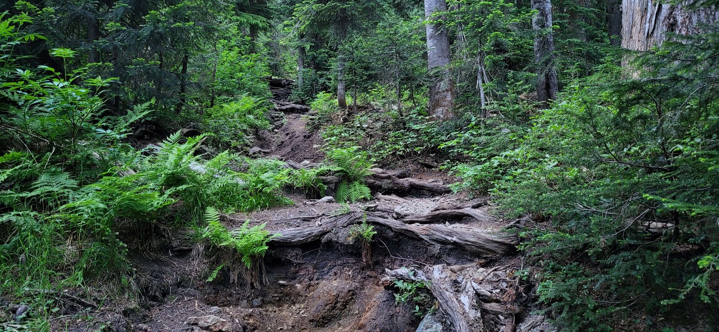 The Forest Service trail was just logged out so there were no trees to cross. The section between the old road and the ridge was in terrible condition. There were 2 foot deep ruts in places and the tread often consisted of jumbles of roots. The trail desperately needs to be rerouted to improve its drainage.