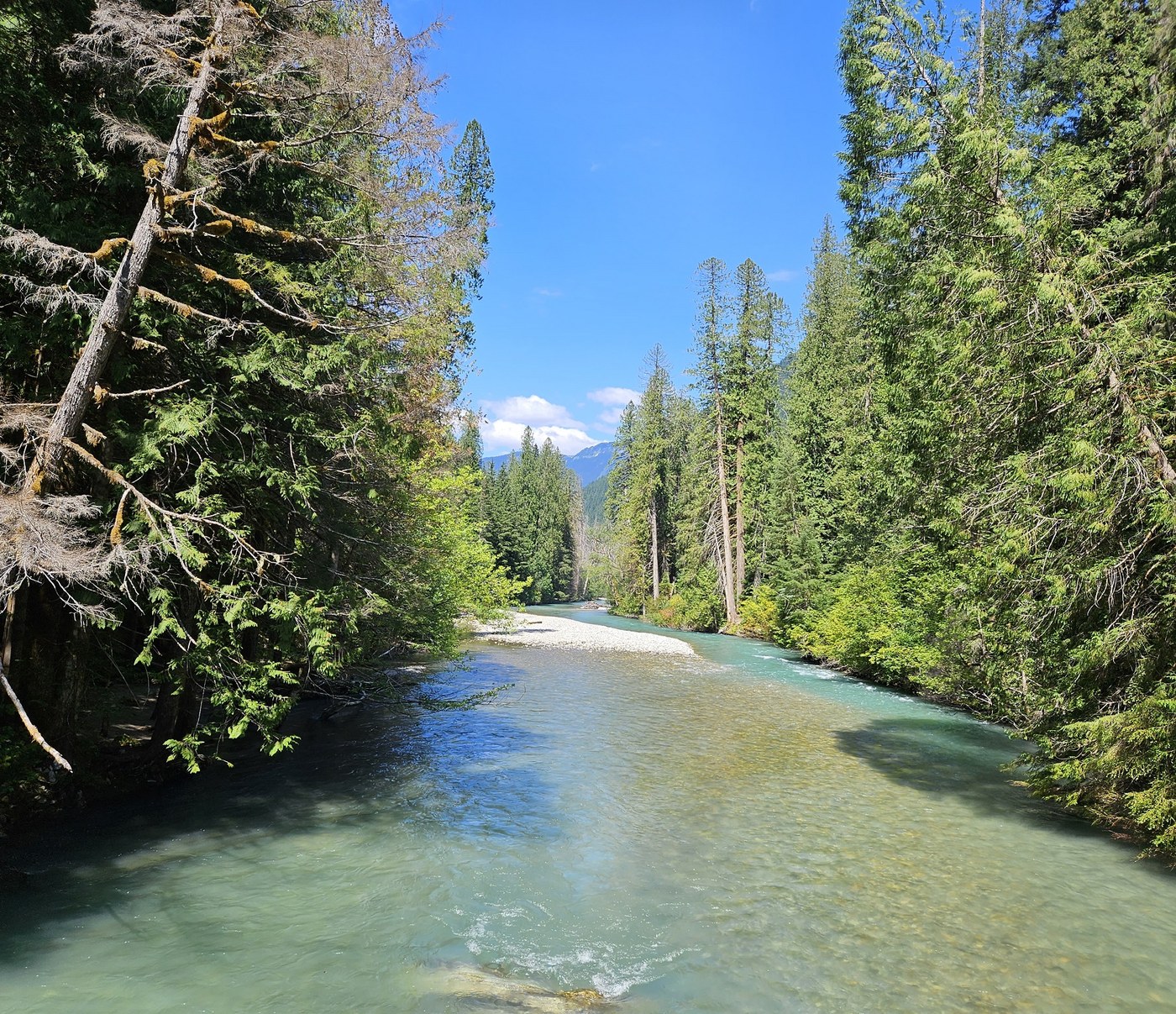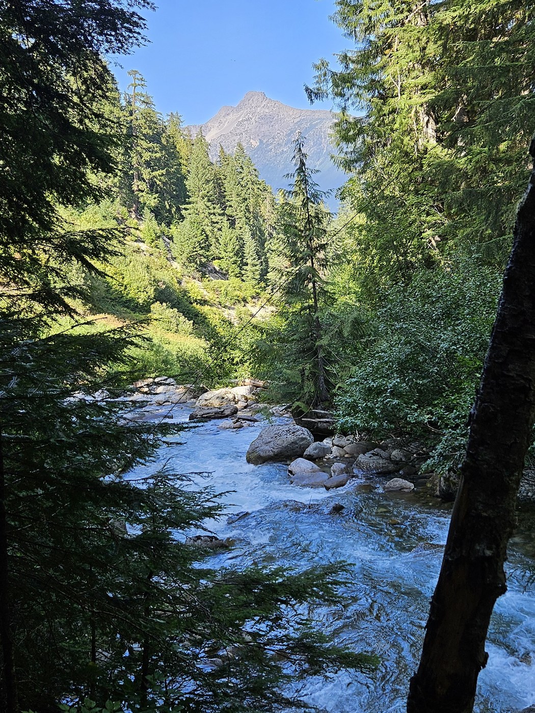 This trail happens in a couple distinct segments. The first follows Thunder Arm (an extension of Diablo Lake), and then free-flowing Thunder Creek, for a couple of miles. This part is pretty level, in good shape, and fairly busy with day hikers. Main attractions here are the lush forest and the creek, which is (like Diablo Lake) is a lovely turquoise color thanks to its glacial origin.