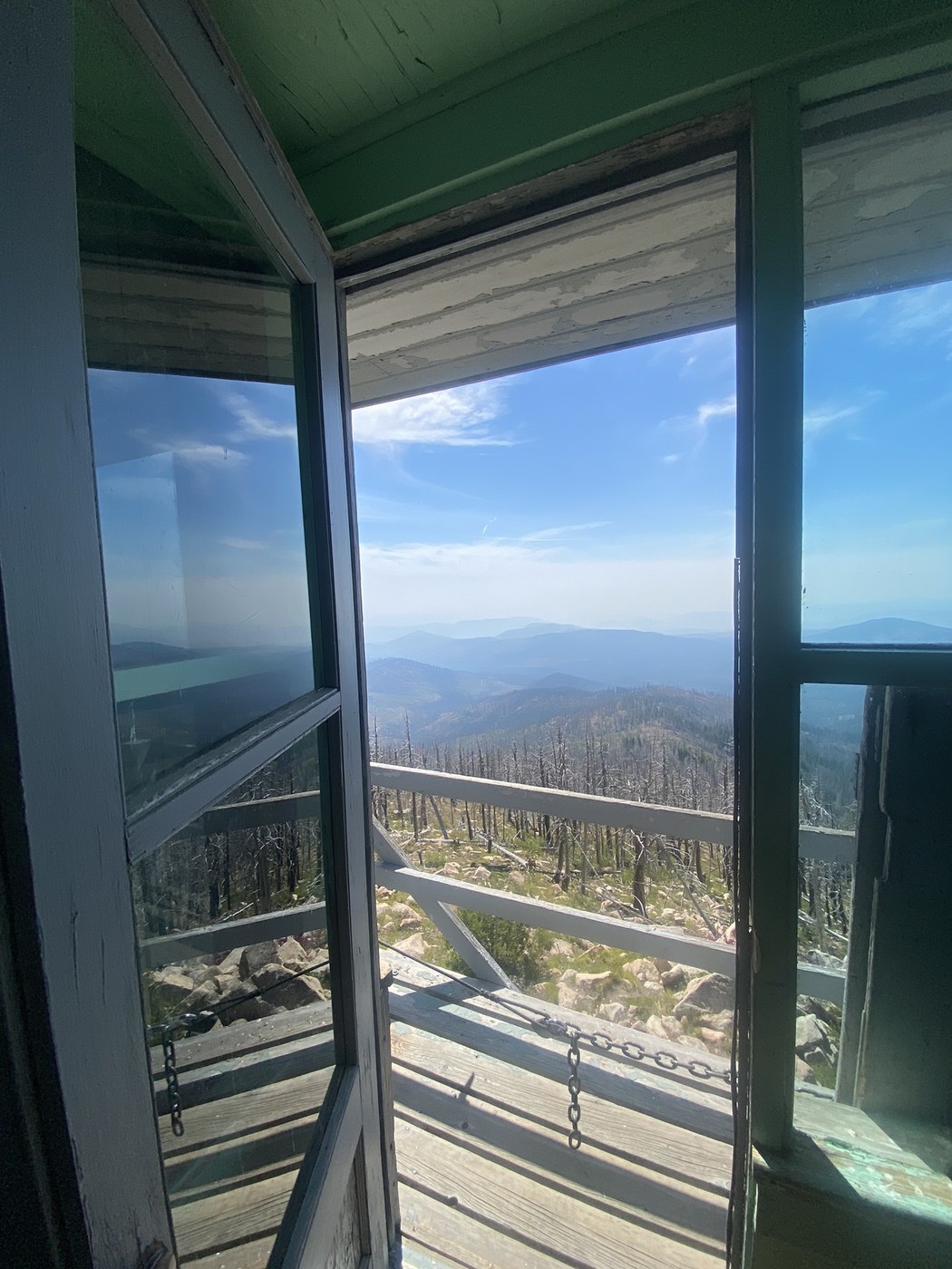 As you can see the tower is accessible with a couple of the shutters broken as well. Removed two dead birds who had nested in one of the cupboard drawers and tried to secure it well upon departure. Cool to see there is still a very very small little charred spot remaining after the rest of the damaged wood was replaced. Got smoky but varying wind had me uncertain if it was from the 2 fires E and NE or the one at Sourdough to the WNW. Bugs finally caught on so I left after some contemplating and journaling.