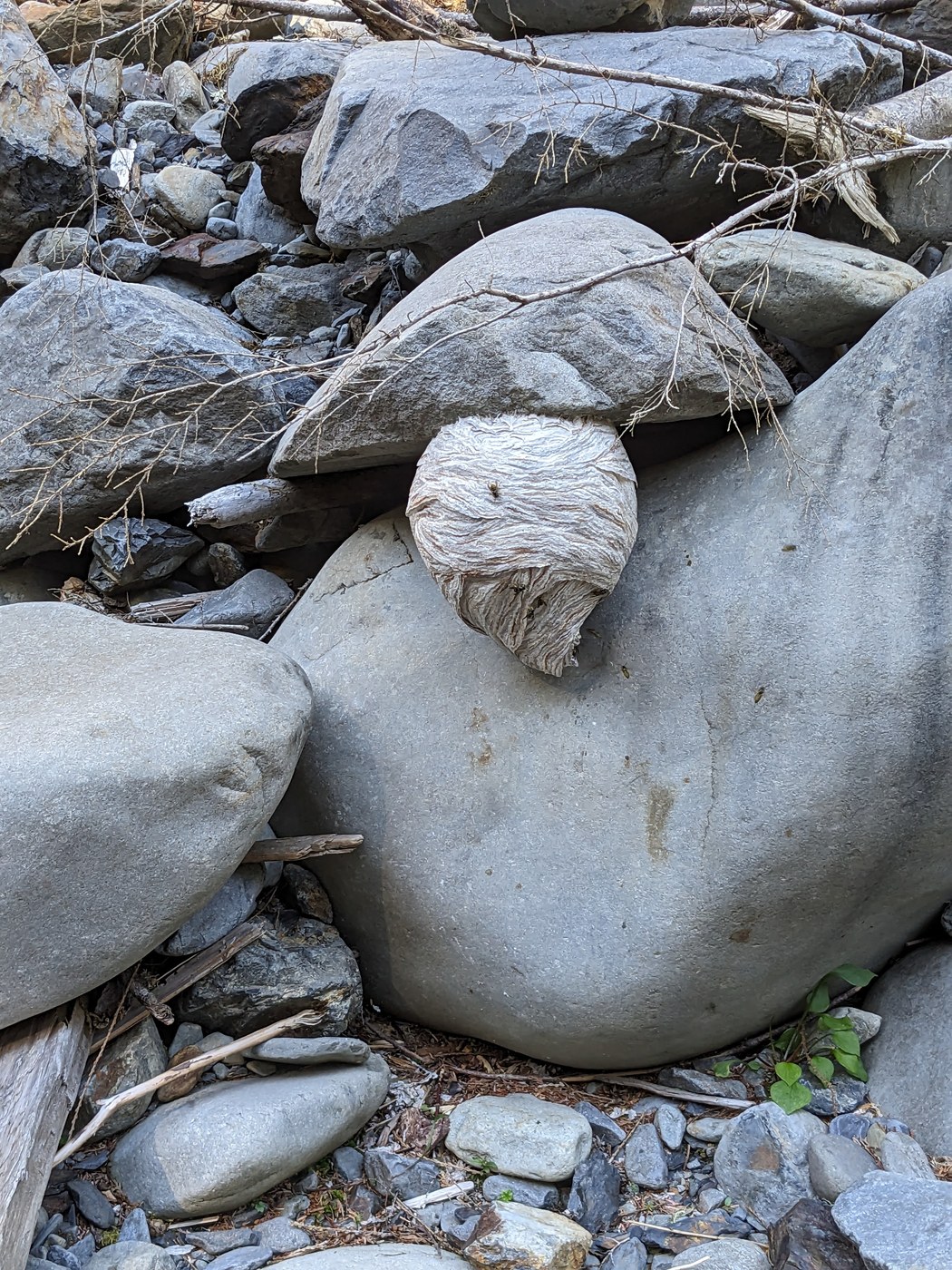 WASP ALERT: There is a significant and actively-defended yellow jacket nest at the ford of Wild Rose Creek. This sucker is massive, bigger than a basketball. If you’re facing the creek, it’s downstream maybe 30-50’ on a rock facing the creek on the Halfway House side of the creek, about waist high. See photo below. There’s another nest in a small alder at Elip Camp, but it’s high enough that the wasps were fine even when we walked around near it.