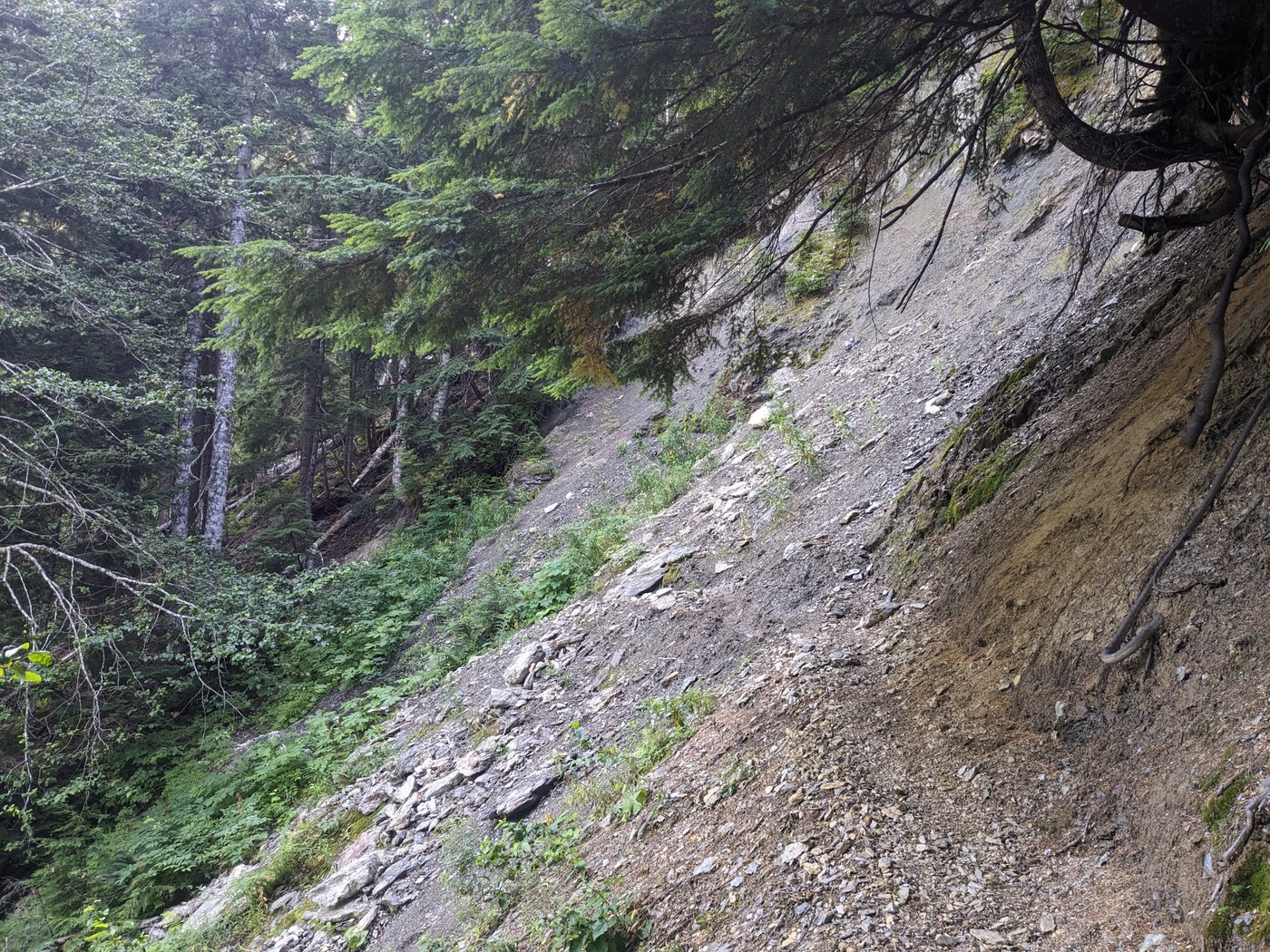 The ford was easy, knee-high when we were there. A ways after 16-mile Camp, there’s an area that’s fine for 2-legged hikers but looks sketchy for stock (pic below). There are a few trees to be cleared on this section, maybe 4? All easy to get around or over with full packs. There was a Black Diamond trekking pole leaned up against a tree near one of these. I propped it up on the downed log mid-trail in the hopes its human was coming back that way and would see it. There are a few brushy areas between 16-mile and Low Divide but never enough to obscure or push you off trail. In all, the trail’s in good shape.