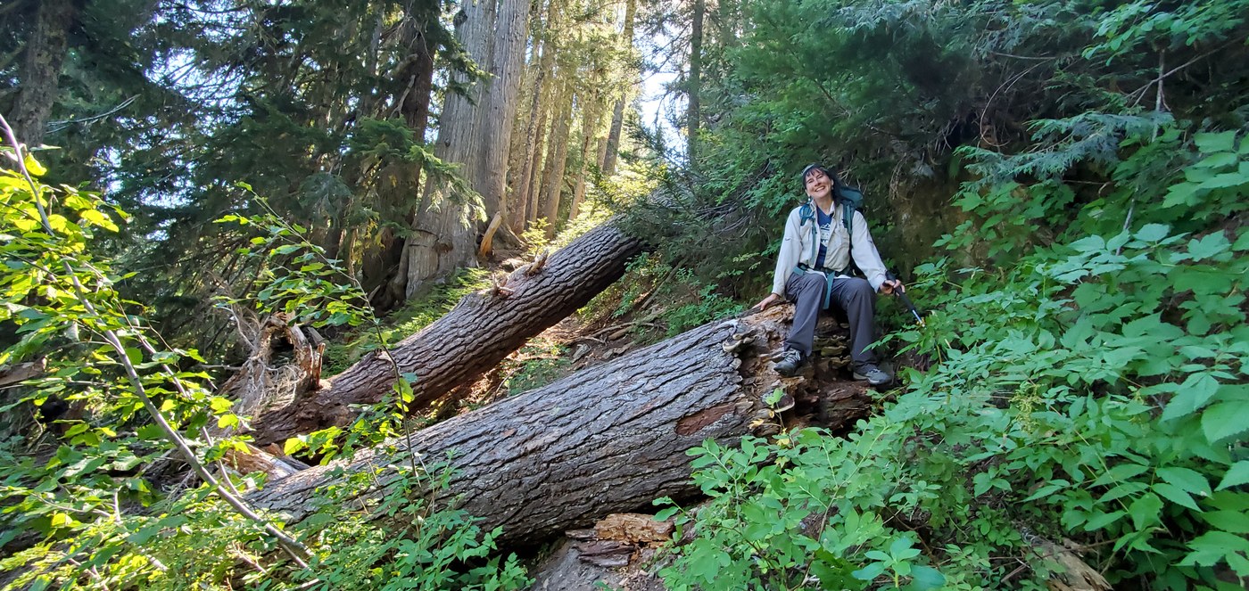 The trail up to Martins Park and Lakes starts at a signed junction just across from Lake Margaret. While parts are rough, the trail is easy to find the whole way. After climbing a little, there’s a boggy, brushy bit with some ankle-deep water and mud running and standing in the trail. For a short section there’s a stream flowing down the trail with lots of brush. Climb a bit more and encounter 4 downed trees (see photo below of two). 3 of these are easy to go around or over, like the one I’m sitting on in the photo. The log behind me is the worst, but fine to negotiate with care by skirting downhill and over then back up to the trail.