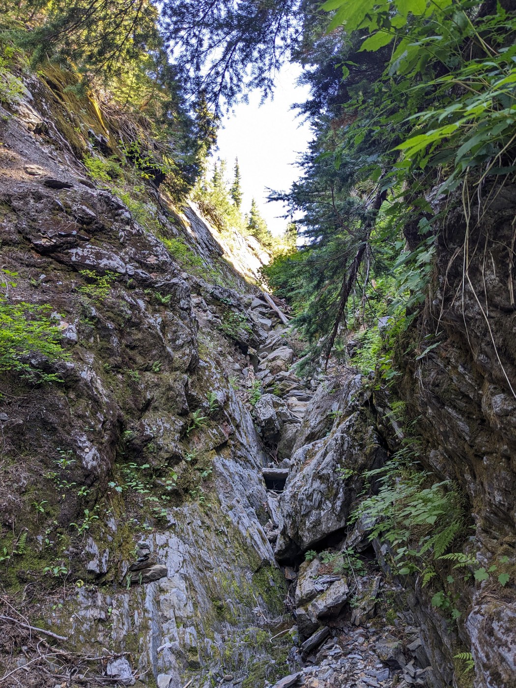 After that is a rocky scramble bit that looks worse than it is (pic below) but deserves attention on the way down. Then up, down into a meadow with a short boggy bit, up and down into another meadow with a longer boggy bit. After this, ford the creek (pretty easy to rock hop). If you start climbing up the rocks on the right side of the creek with no discernible trail, you missed the ford. Not that I’d know, haha. Then is an often brushy stretch traversing the hillside. The brush here has pushed the tread downhill and makes for some tricky footing. There’s another few muddy bits.