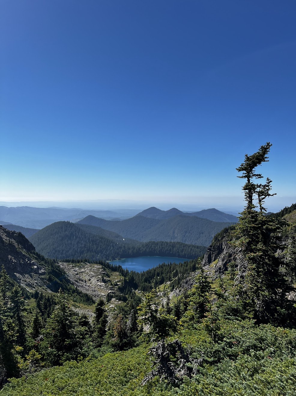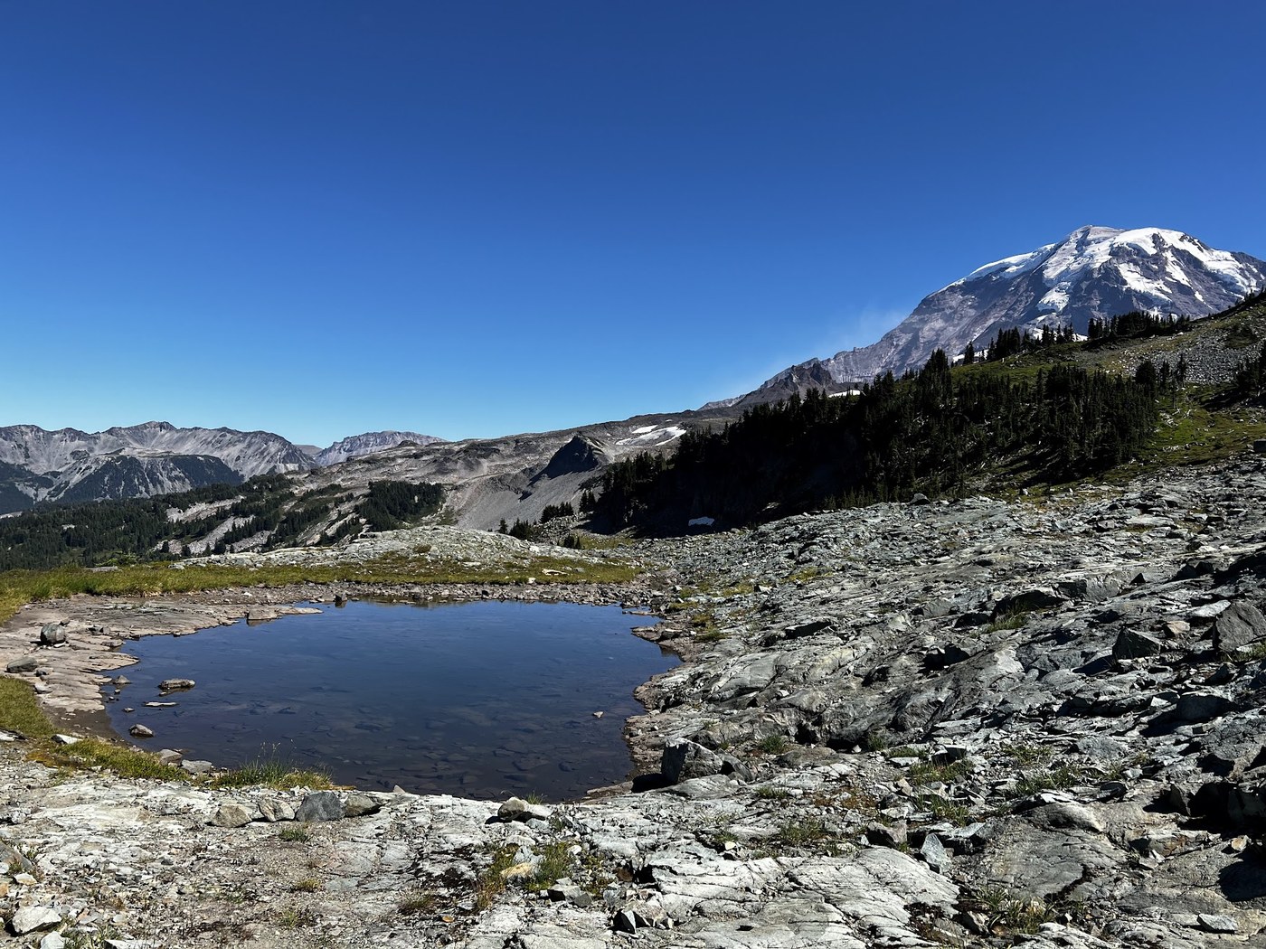 From the top of the pass I was able to look at Rainier one last time before setting out for my car at the lake. It’s an unmaintained trail back to the parking lot, and it is a little overgrown (some bad eroded root sections and steep), but not rocky at all and you get a nice view of the lake most of the way down.
