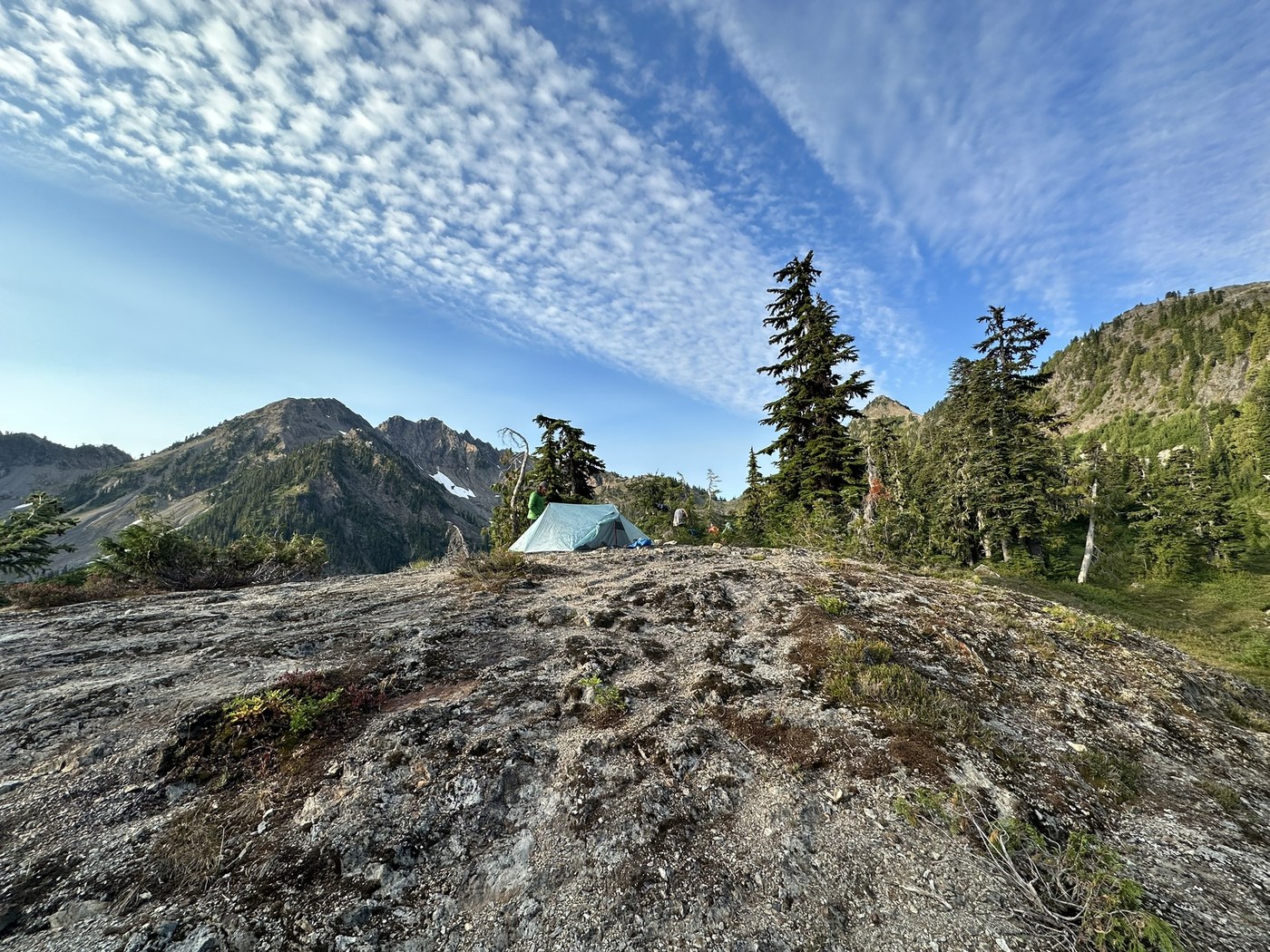 The North Fork Skokomish River Trail is in great shape and only gains about 1000ft in the first 8-9 miles. The river starts getting really pretty about 5-6 miles in when you cross the river near Big Log Camp/the intersection with Six Ridge Trail. We ate first lunch at Camp Pleasant (appropriately named) and Nine Streams Camp also looked lovely as we passed. The trail really starts to climb after this and gains almost 3000ft in 3 miles to First Divide where we enjoyed the view and had second lunch. The trail down to Upper Duckabush River is a little rough with quite a few blowdowns, and some narrow, overgrown and rocky sections. You descend first past the huge meadow where Home Sweet Home camp is, looked like another beautiful option. Once we got down to Duckabush River Trail we turned up river towards Marmot Lake/O’Neil pass. This trail also is a little rough with some blowdowns and brushy sections. It climbs another almost 2000ft, getting steeper the further on you get. You have to ford Duckabush River towards the end but it is not deep, one member made it over on rocks/logs everyone else got their feet wet (I did it barefoot to save myself from wet shoes in the morning as it was the end of the day). Finally we got to Marmot Lake and it was really beautiful, gorgeous views of lake and surrounding mountains. We had hardly seen anyone all day hiking so were surprised to find multiple groups at the lake and it took awhile to find spots to camp-we divided the group and my partner and I ended up pitching our tent on the ridge overlooking the lake and the mountain, pretty much the most beautiful tent spot I have had. Weather was mild, stars were gorgeous, very tired so slept well.