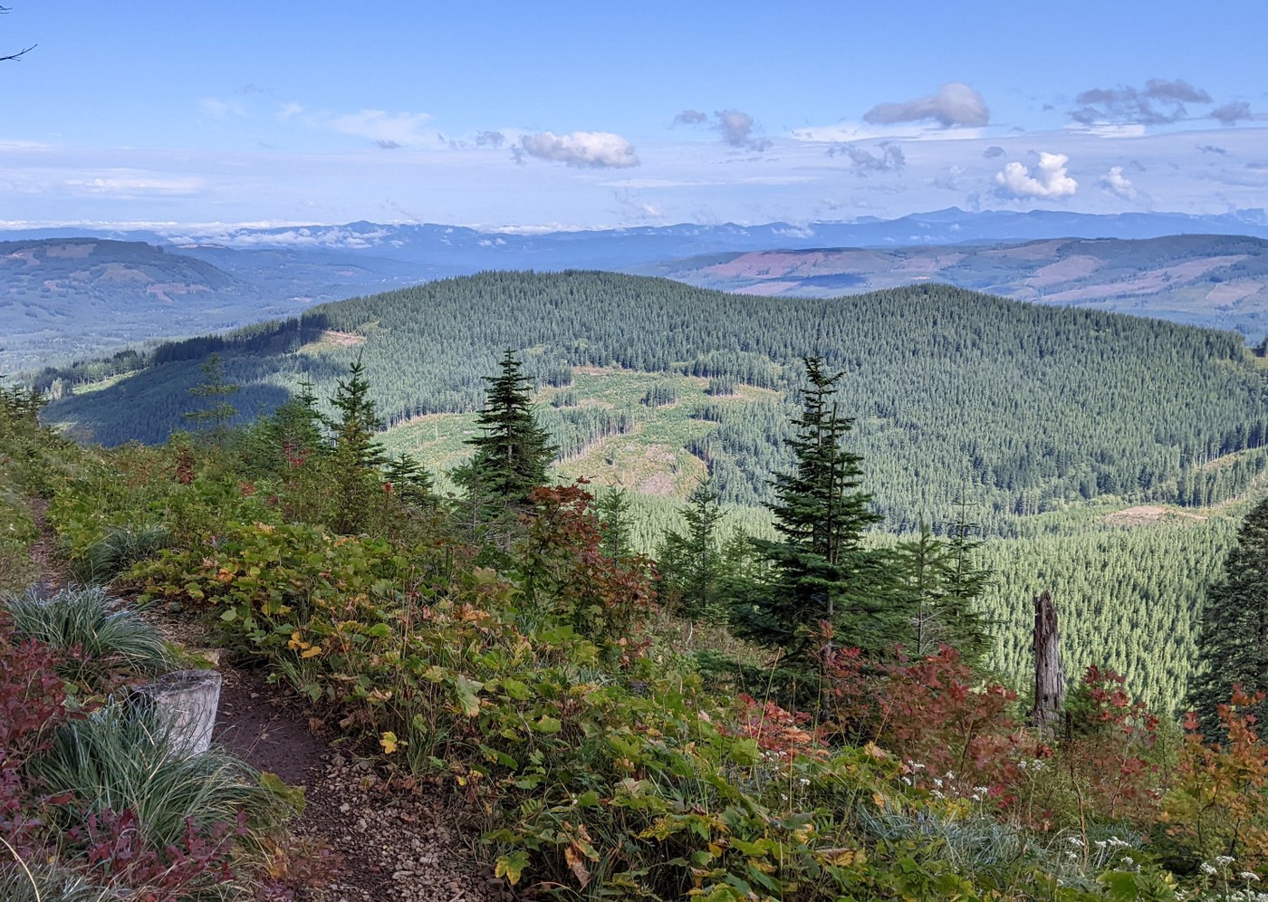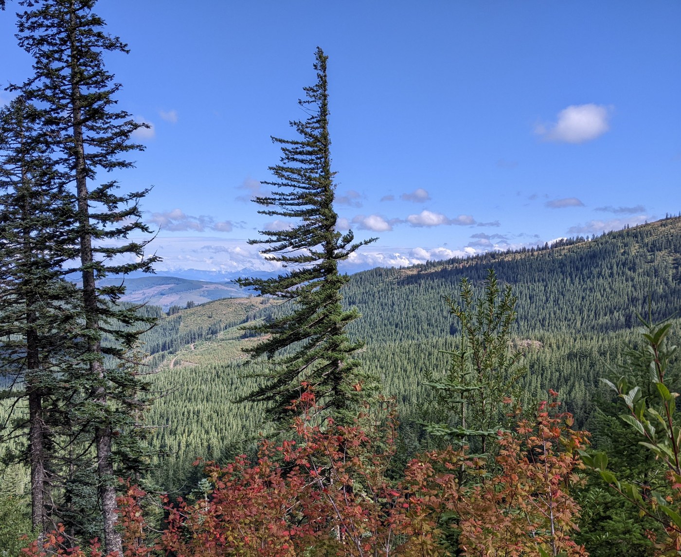 Really enjoyed the views from the switchbacks on the Tarbell as we descended about 990' to the Falls. A few stretches of trail, above where a logging road joined, could use brushing. A few very short stretches, usually at switchbacks, hit grade 40-47. But the fall colors in the maples, against the more distant firs, mountains, and sky, looked beautiful. I enjoyed trying to figure out where across the landscape the Tarbell came in from the north along Kloochman Butte, and where the Appaloosa Trail ran through the Douglas fir forest and along L-1210 on its way back to Rock Creek Campground. Met the only other hikers I saw, a couple who said they'd camped at Hidden Falls last night, on one of the lower switchbacks.