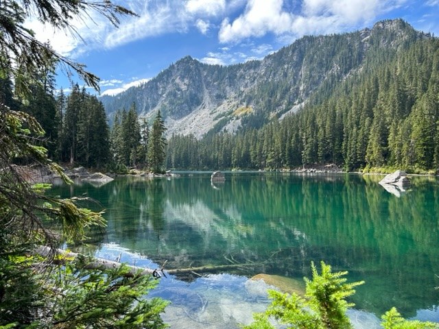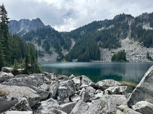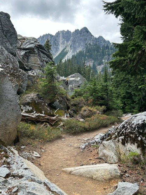 WTA rates this hike as hard, but on a scale of 1 to Gothic Basin, I’d give it a 7. There’s definitely some steep parts with rooty or rocky bits to navigate, but I found it to be a lovely trail. AND, if you’re an alpine lake lover…this trail gives you two for the price of one! You start in old growth forest and there were lots of places along the way to fill up with water in addition to the rushing sounds of Surprise Creek.