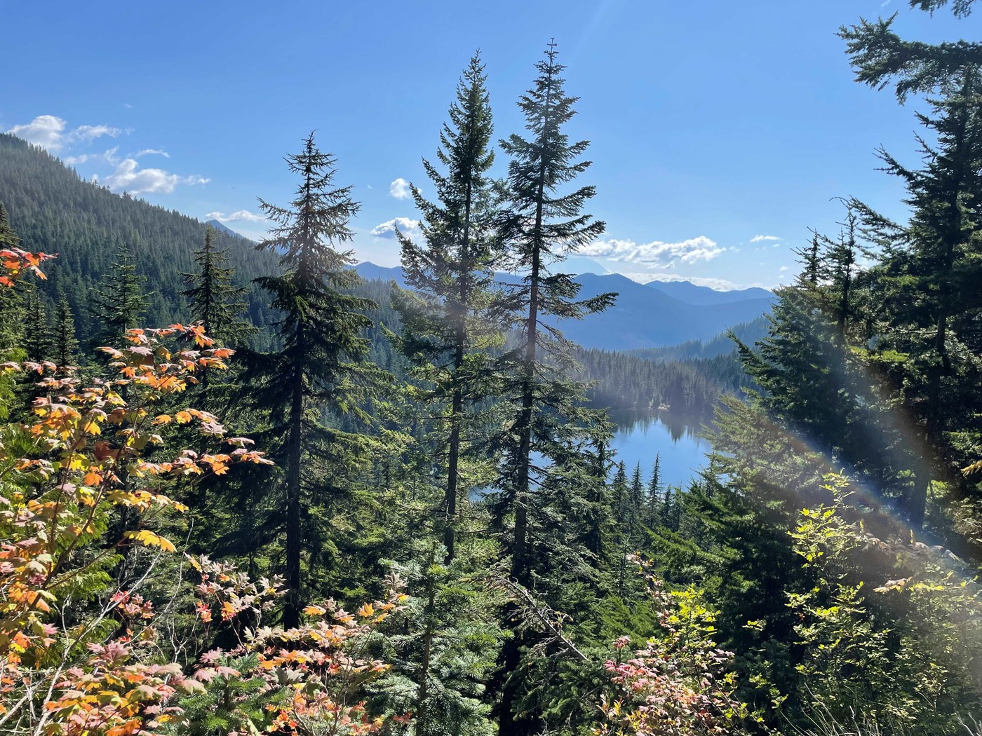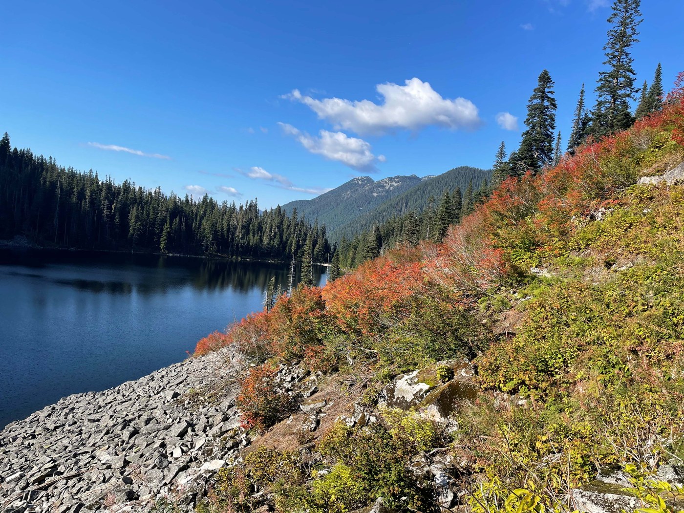 This was a great hike for an overnight, with a nice trail, fall colors (vine maple), and good views of some of the Snoqualmie peaks. It’s about 6 miles from the Pratt Lake trailhead to the excellent campsites at the north end of the lake, well worth it despite the 800 elevation drop from the saddle which separates the South Fork from the Middle Fork of the Snoqualmie River. The views of Mt Rainier just before this saddle have become partially obscured over the years by the trees.