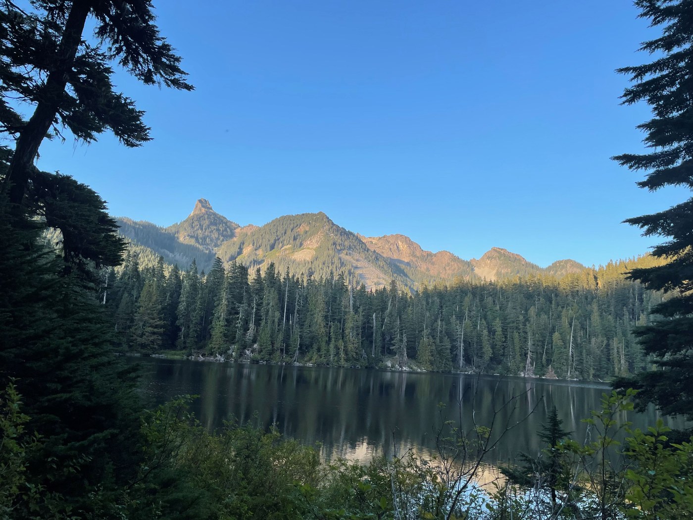 As a half mile side trip, I walked over to the Lower Tuscohatchie Lake, which had gorgeous evening views of the peaks from The Tooth to Kaleetan. This trail, like the Pratt Lake trail, was well maintained, also fairly level, though more like a backcountry than mainline trail. I’d already taken a quick dip in Pratt Lake but Tuscohatchie felt warmer, with adequate, though smaller campsites. I was the only camper at Pratt Lake but I’d met several day trippers coming and going. Beautiful fall weather, no bugs.