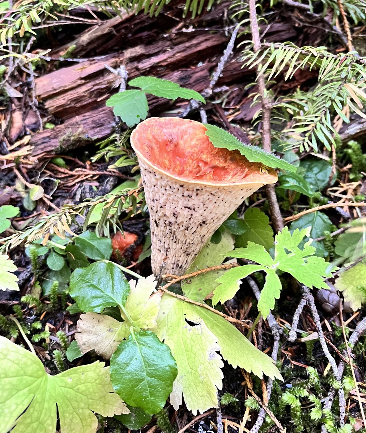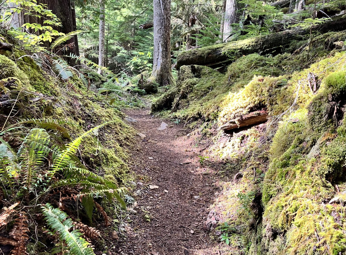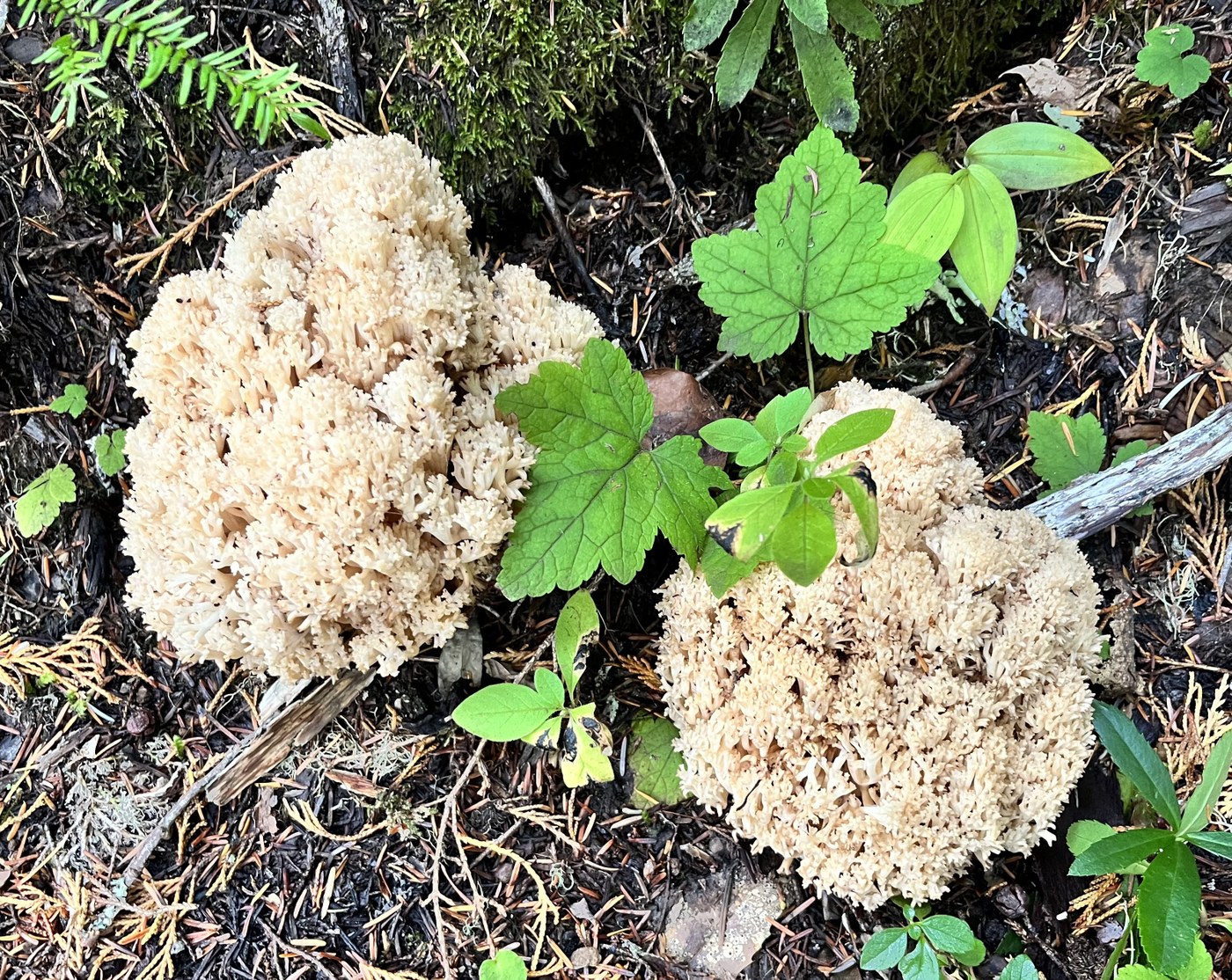 Lots of cool mushrooms were popping on the eight mile round trip hike from Mowich Lake to South Mowich Campground on the Wonderland Trail. Some edible, some not. The 2,400 descent was on a shaded forest path amongst enormous hemlocks and cedars. There is a bees (wasp?) nest about 2.8 miles down on the left in a dug up hole in the ground. We walked past the nest without the insects getting riled. The river by the campground was a perfect lunch spot on this sunny day.
