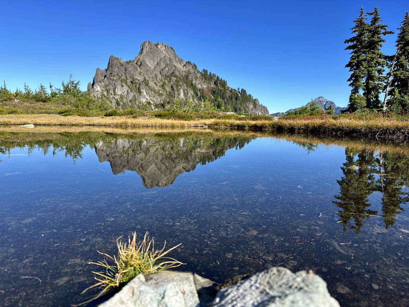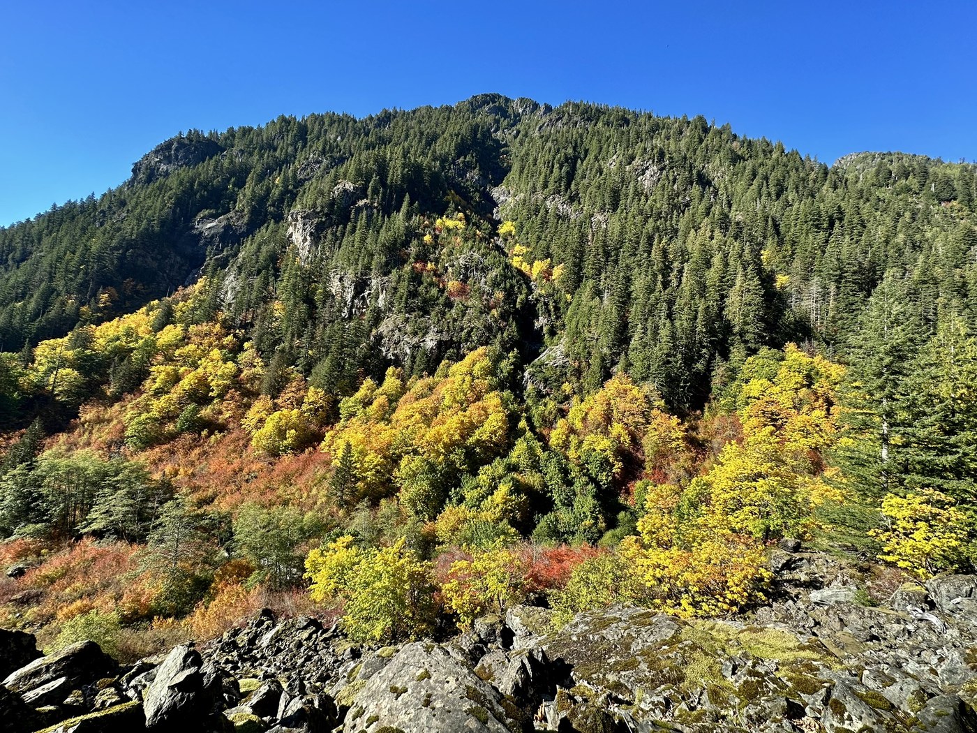 The trail starts off deceptively pleasant but after a mile or so is more rocky. The third mile is spectacular right now with color - big-leaf maple and vine maple. If you go to Forgotten Meadows, the colors are amazing up there too, adding berry bushes and mountain ash. As noted in previous posts, there are active yellow jacket nests in the trail. A temporary sign at the trail head has a map behind it showing where they are. I only saw one about a quarter mile past the creek crossing as you head up. There is a tiny detour around the nest. People have build small piles of sticks and rocks to indicate the area. Leave them alone and they will leave you alone. And please leash your dog on this trail.